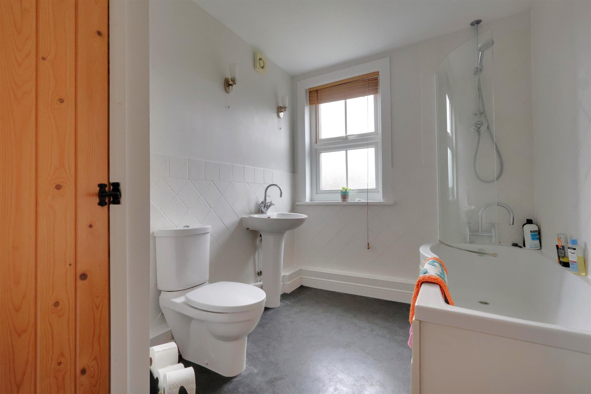Airing cupboard. P-shaped bath with screen and shower attachment. WC. Ceramic sink. Radiator. Extractor fan. Frosted double glazed window.
