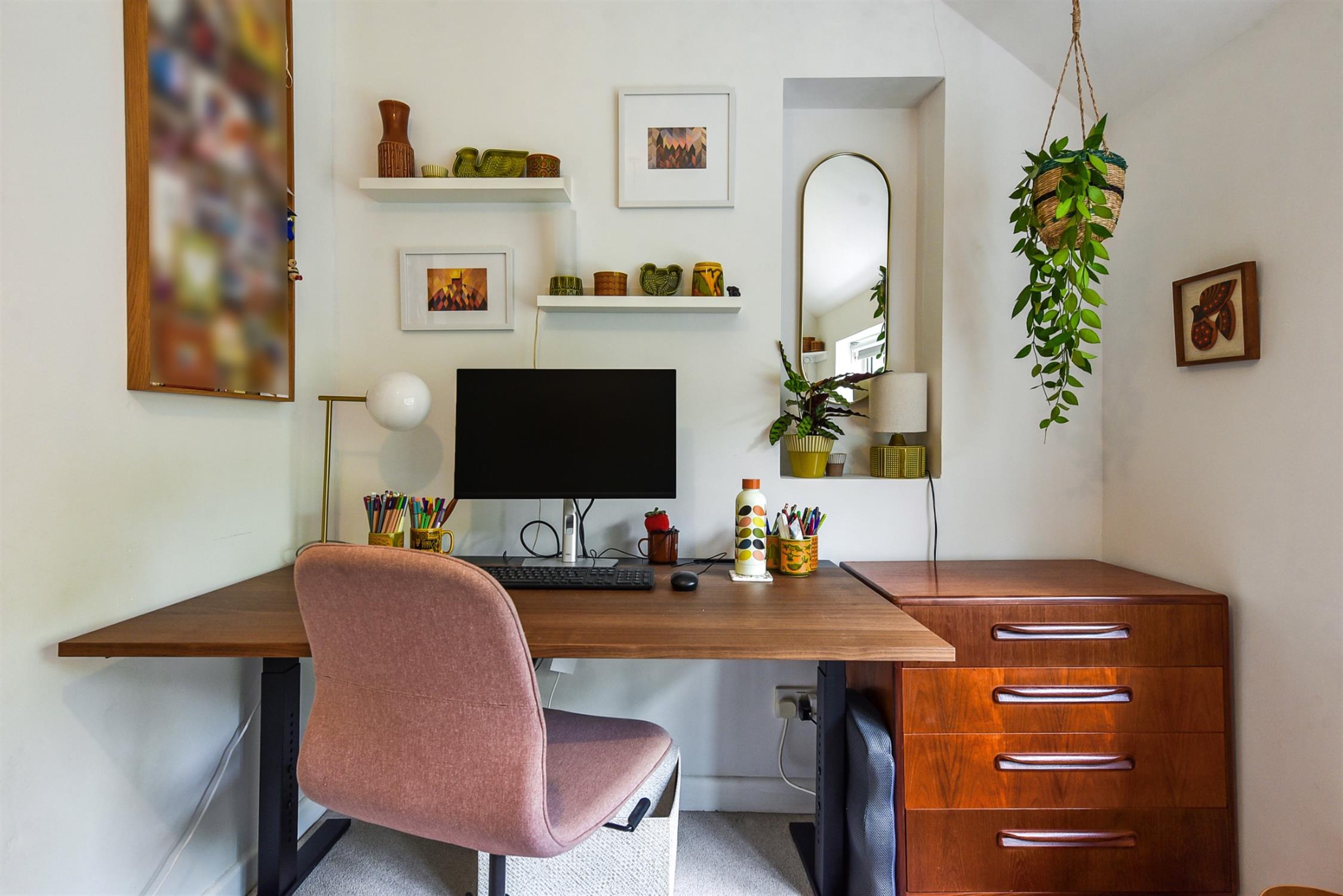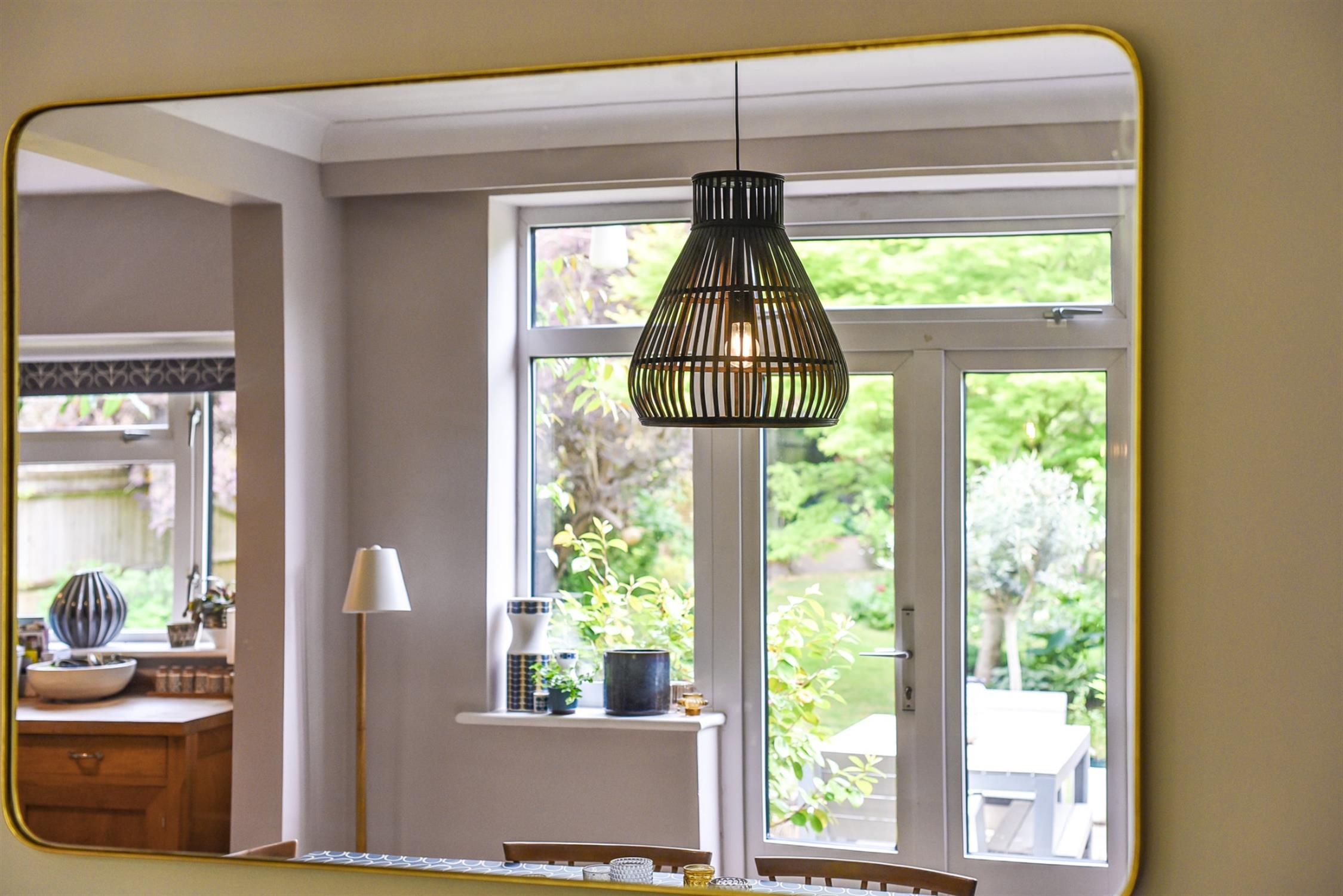Previously three rooms, open archways allows for open-plan dining adjacent to the kitchen. Fully-fitted kitchen with wooden worktops. Neff gas hob and oven below. Double sink and drainer. Ample units in white with with pull-out shelves. Fitted dishwasher and space for fridge freezer.
