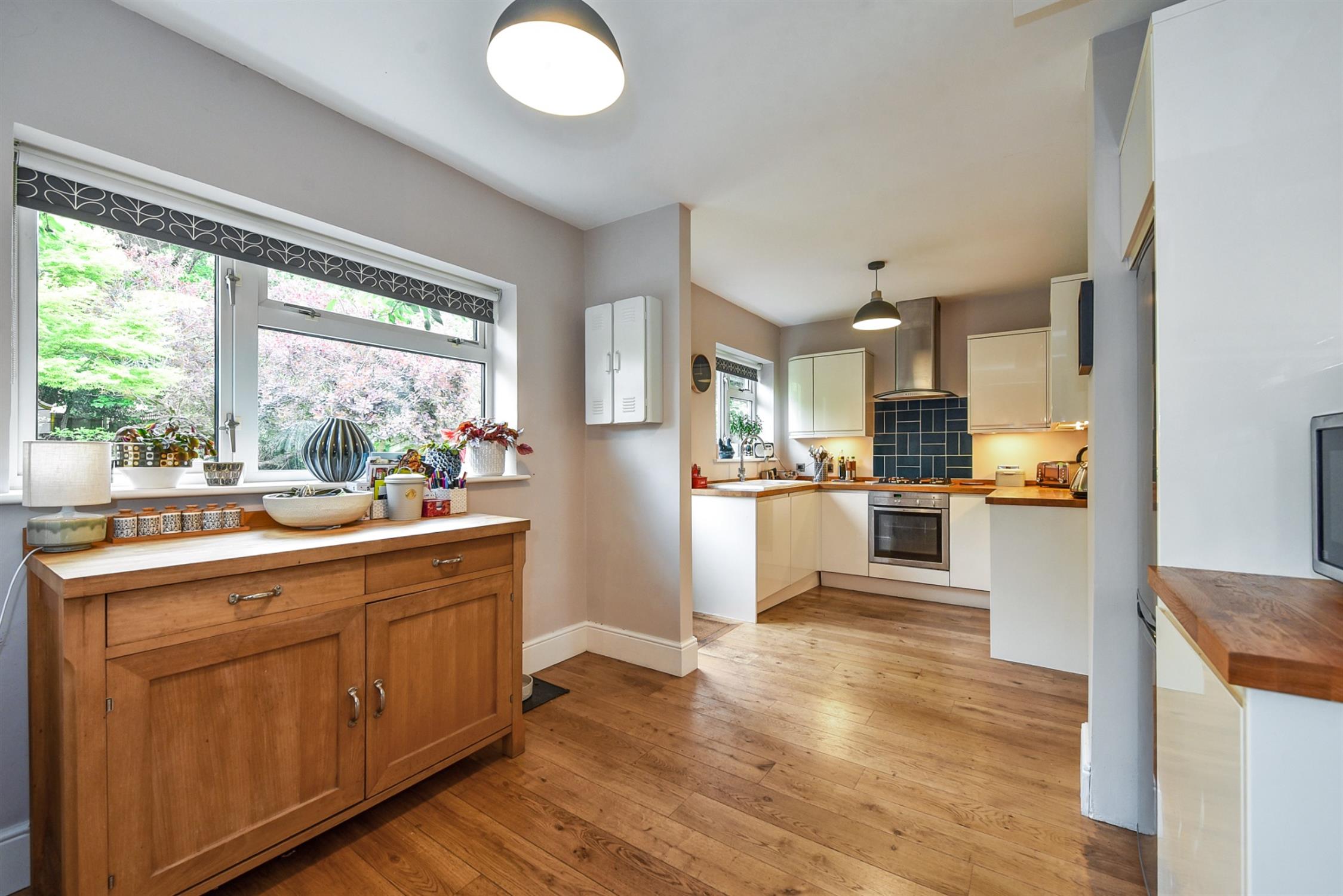 With a large window overlooking the front garden, this bright and airy space would serve well as a family/play room. Storage cupboard with boiler, and a second storage cupboard with washing machine. Door leading through to kitchen and dining area.