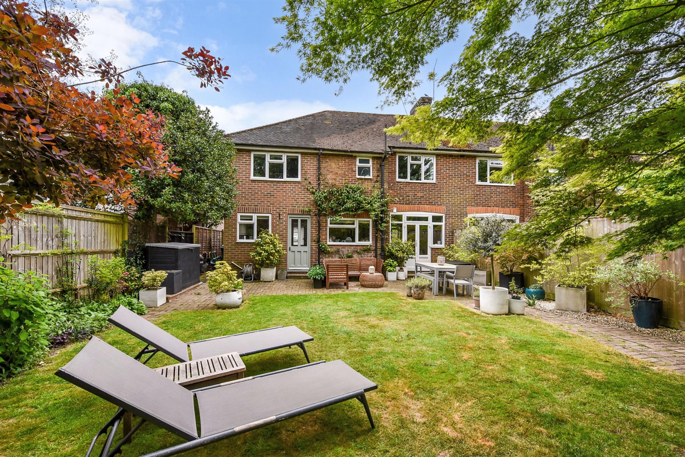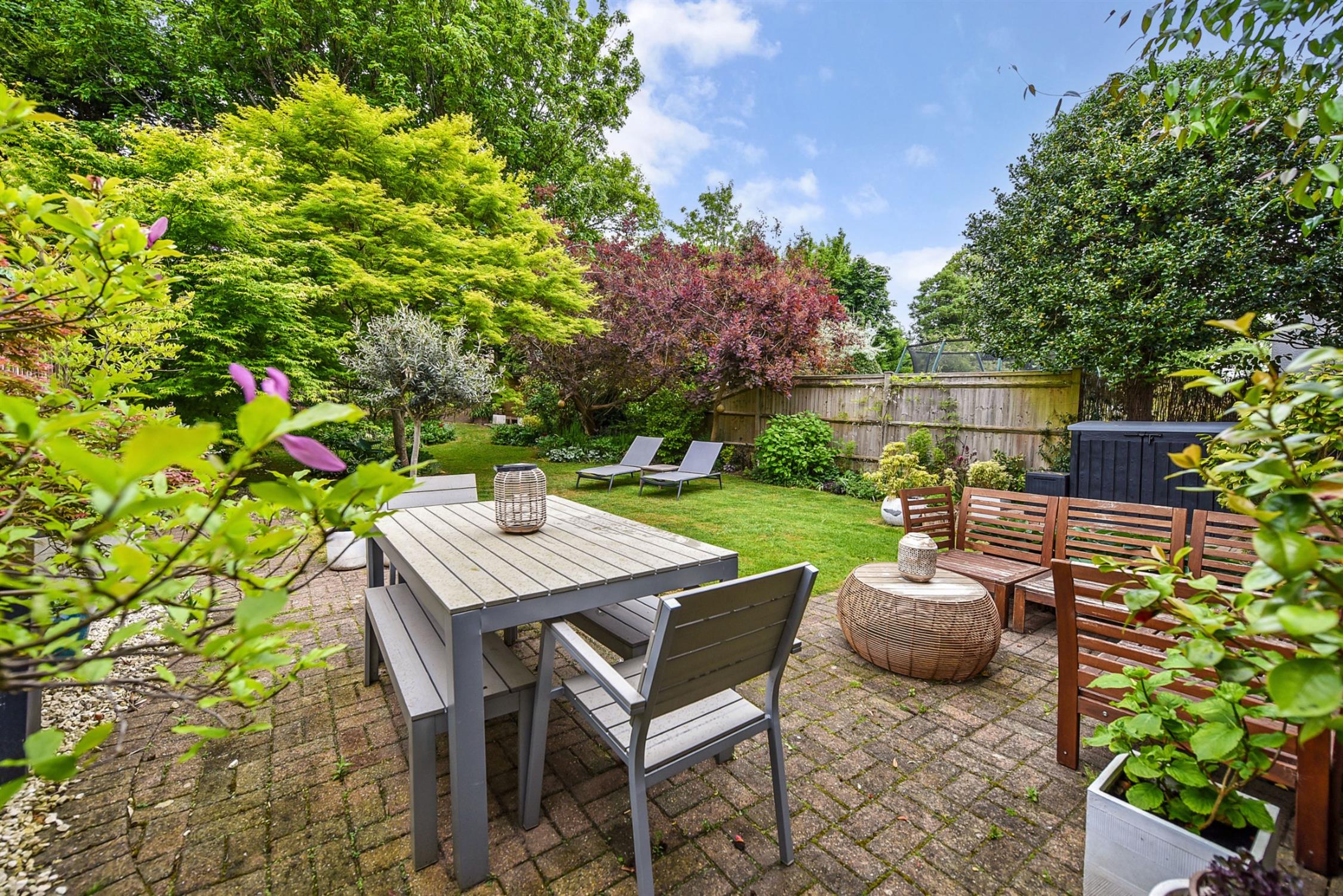 Patio space adjacent to the kitchen/dining area, with a well-presented lawn, and manicured flower beds throughout the garden. Some beautiful attention to detail and lovely planting results in a lovely haven.