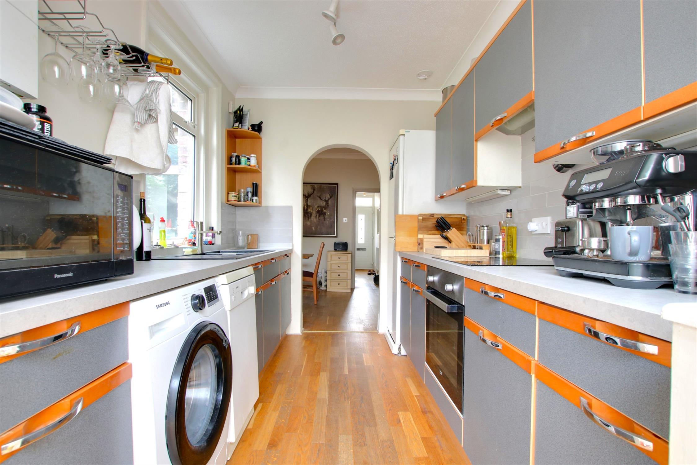 Laminate flooring. Tiled splashback. Matching wall and base units. Inset sink. Space for washing machine, dishwasher and fridge-freezer. Integrated electric fan oven and hob with extractor. Wall mounted combination boiler. Double-glazed window to side aspect.