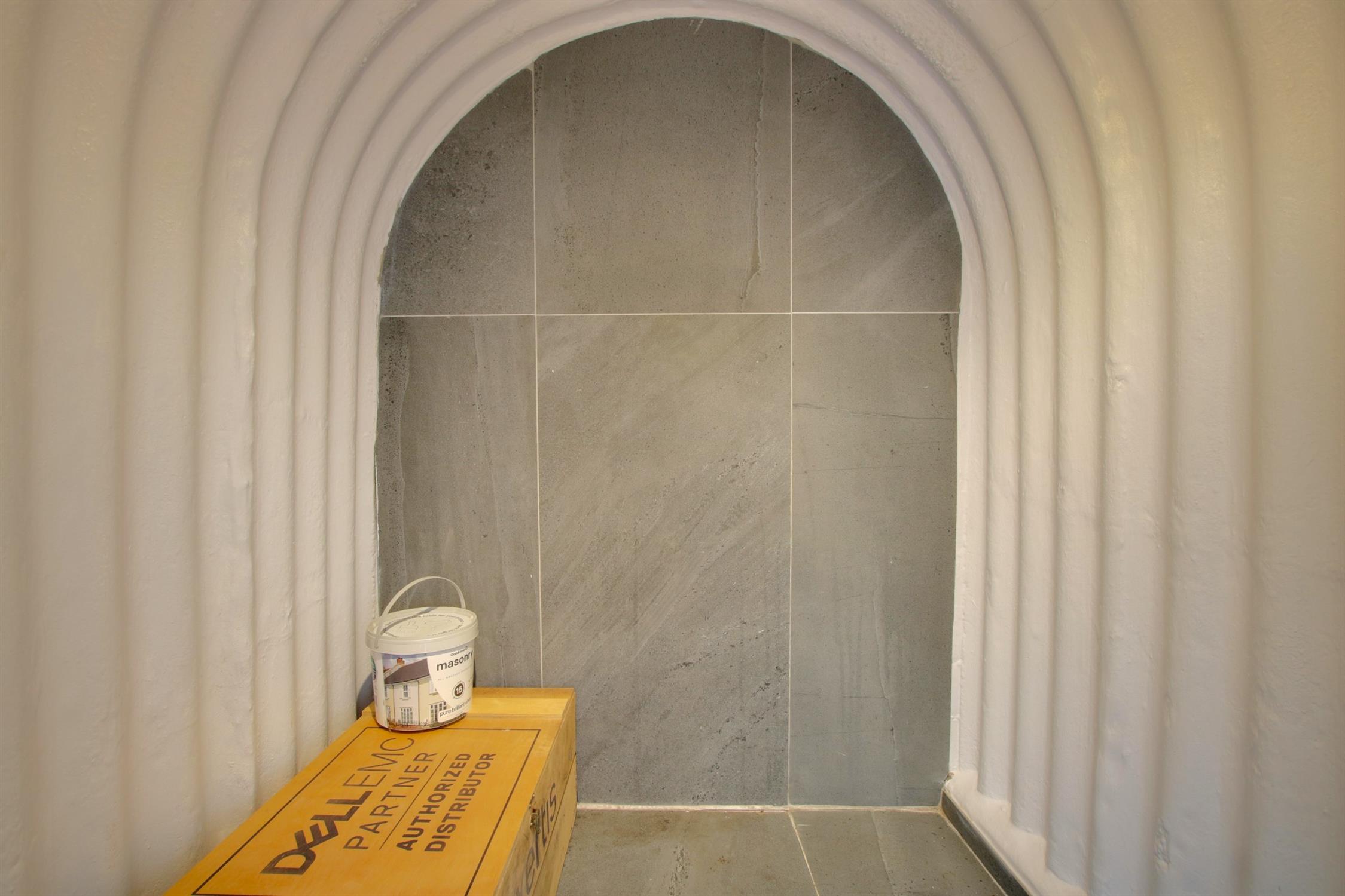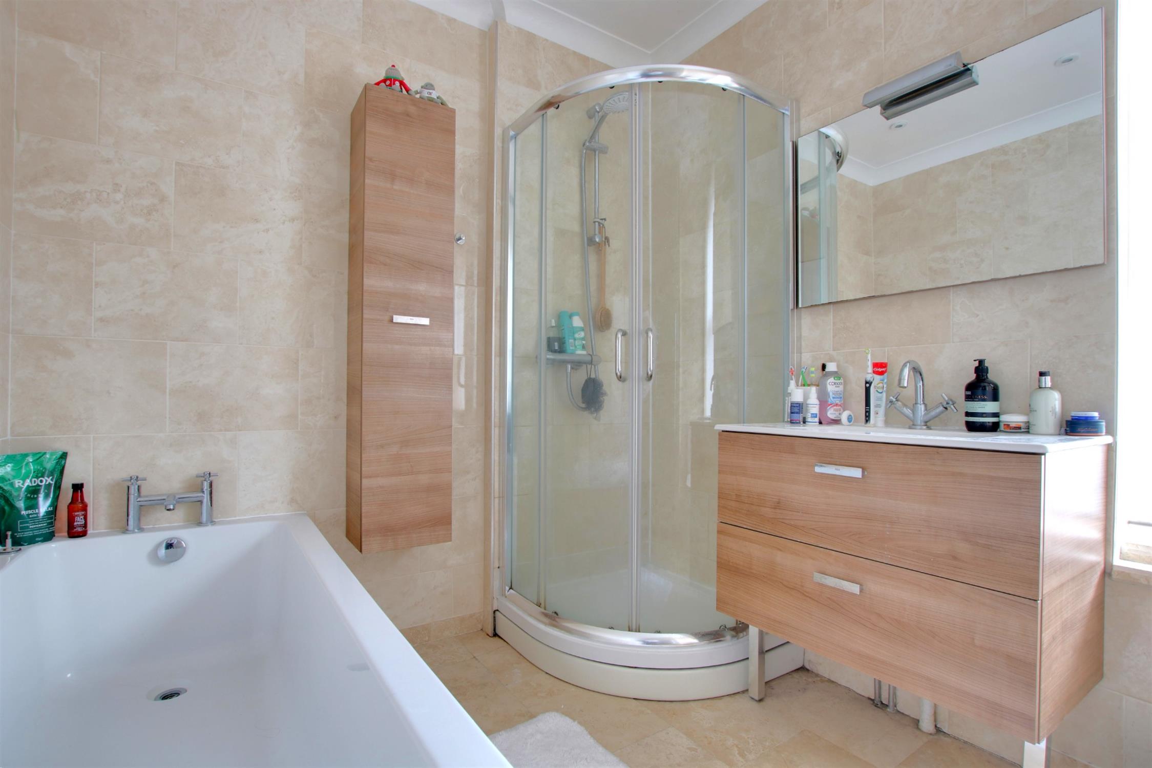 Tiled flooring and walls. Tiled enclosed bath. Corner shower cubicle. Low level W.C and basin. Extractor fan. Double-glazed window to rear aspect. Heated towel rail.
