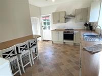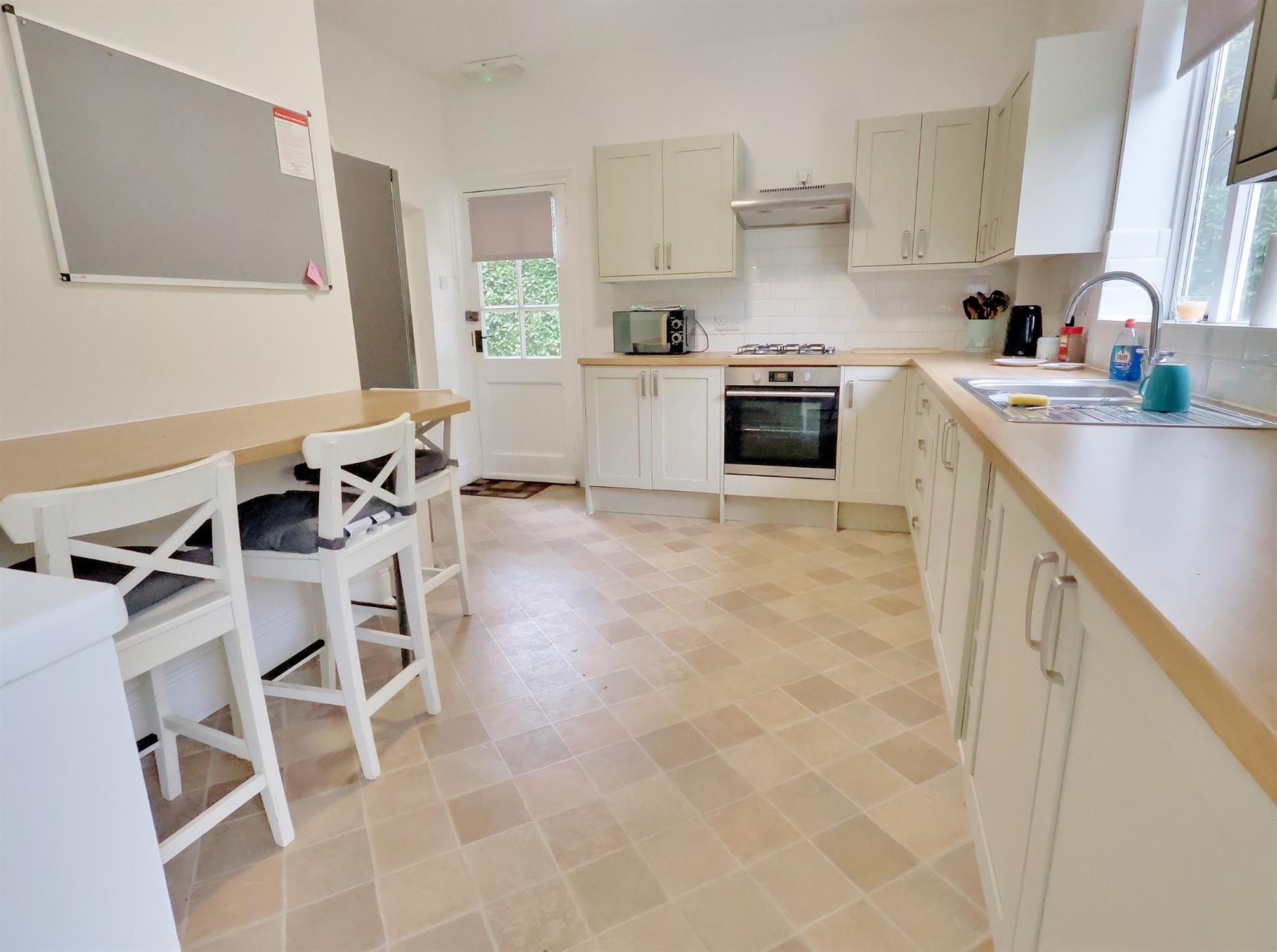 Window to side. Range of fitted wall and base units with working surfaces over. One and a half bowl stainless steel sink unit with mixer tap. Tiled splashbacks. 4 ring gas hob with extractor over. Built in electric oven. Breakfast bar. Space for fridge freezer. Door to side. Arch through to: