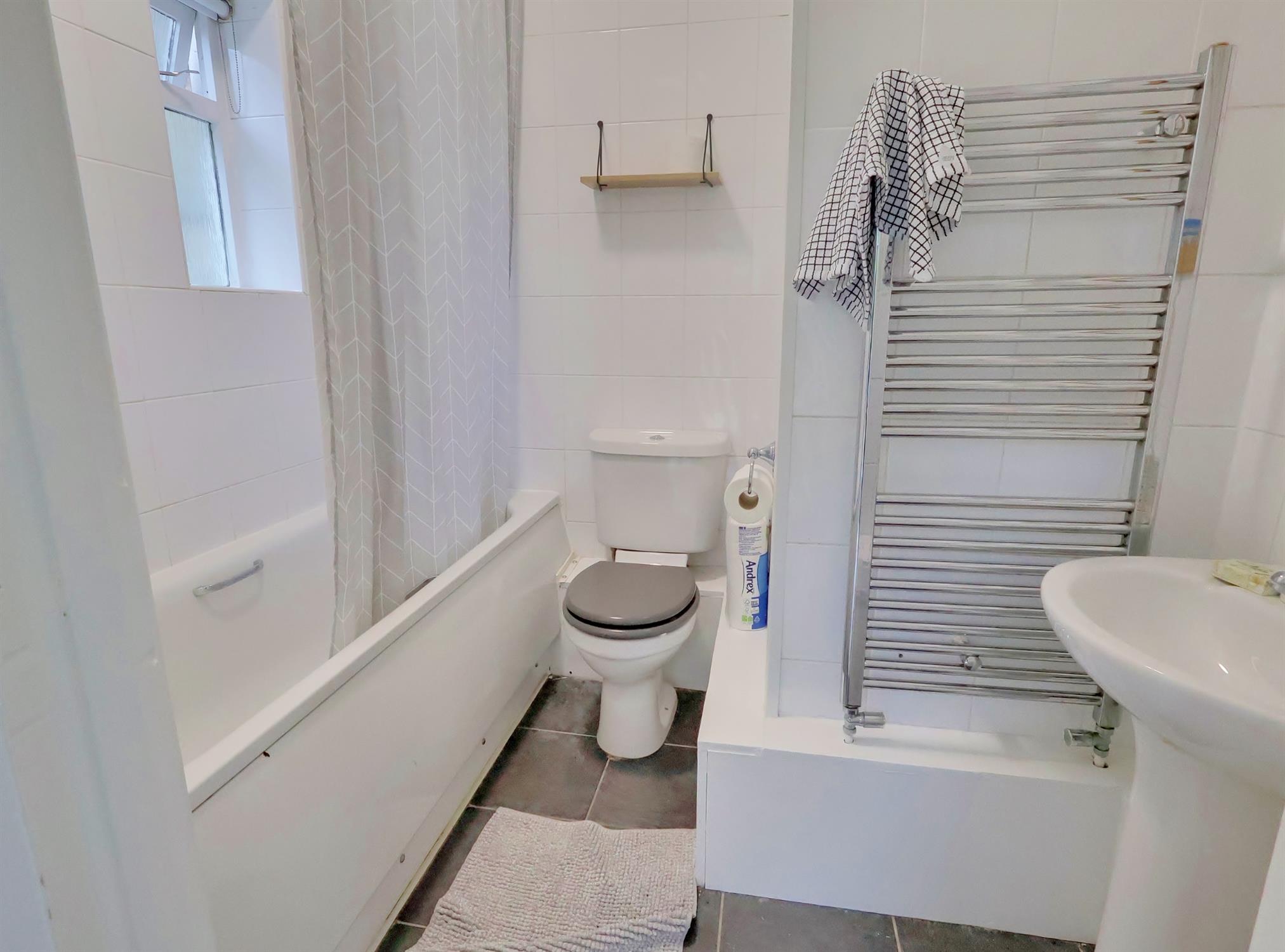 Window to side. Low level WC. Pedestal wash hand basin. Panelled bath with shower over. Fully tiled. Heated towel radiator.