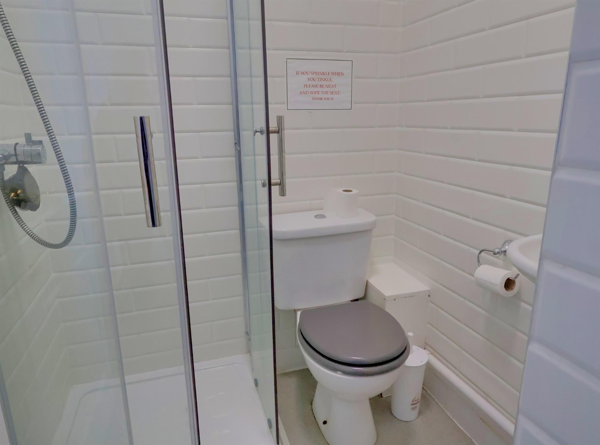 Low level WC. Wall mounted wash hand basin. Corner shower unit with glazed screen. Complementary tiling. Heated towel rail.