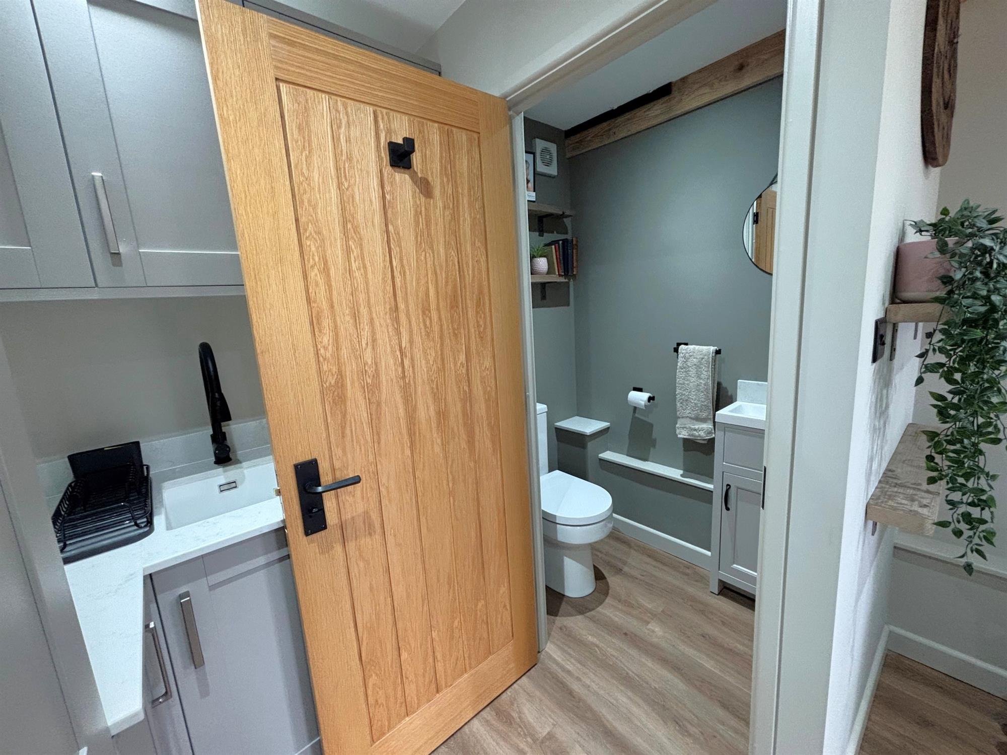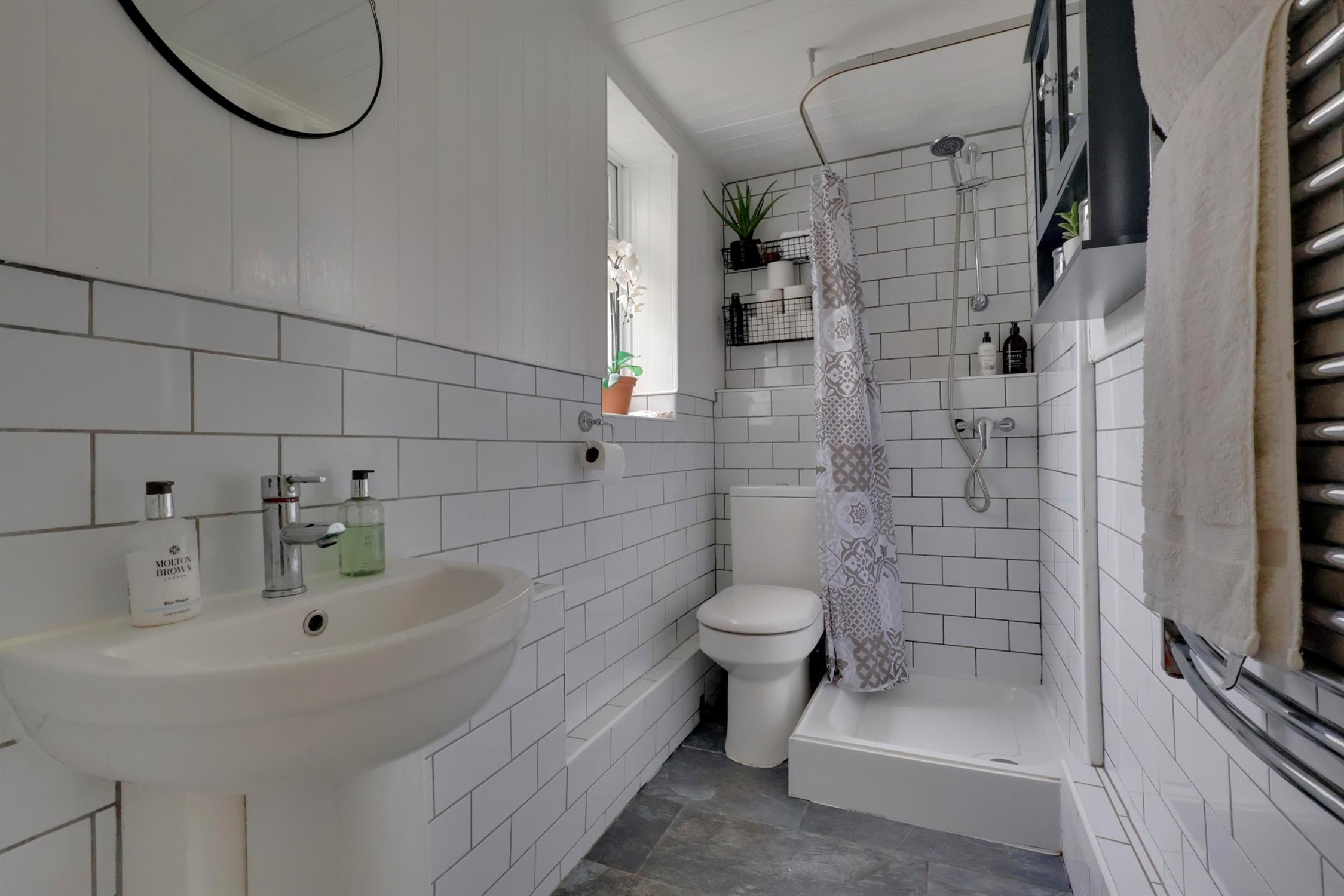 Shower cubicle. WC. Ceramic sink. Heated towel rail. Frosted double glazed window.