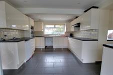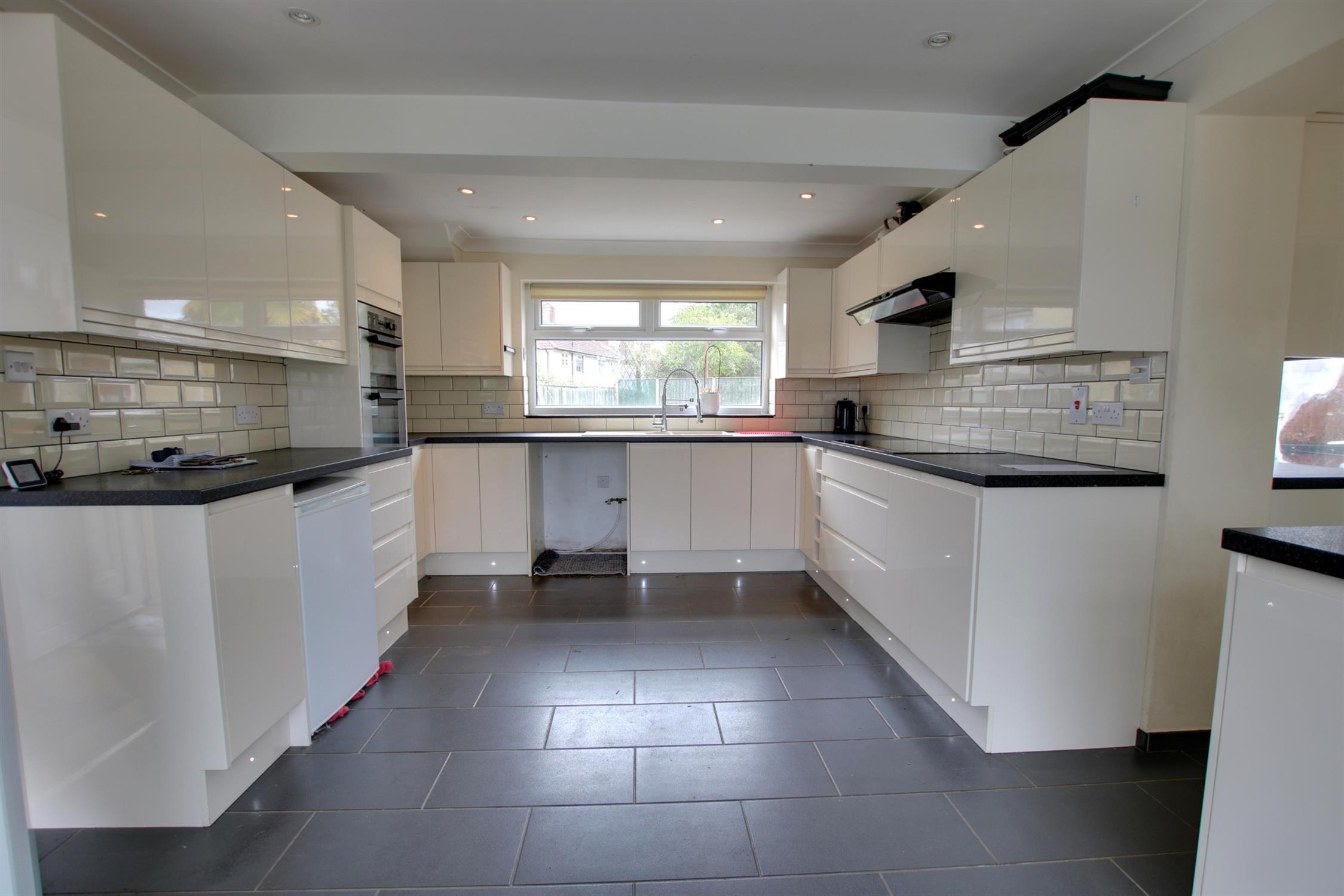 Double glazed window to rear aspect. Double glazed bay window to front aspect. Coving to smooth ceiling with recessed lighting. Single drainer one and a half sink unit with mixer tap and cupboard under. A range of matching eye level and base mounted units. Built-in double oven. Fitted five ring electric hob with extractor over. Space for dishwasher. Space for under counter fridge. Tiled flooring. Opening to:-