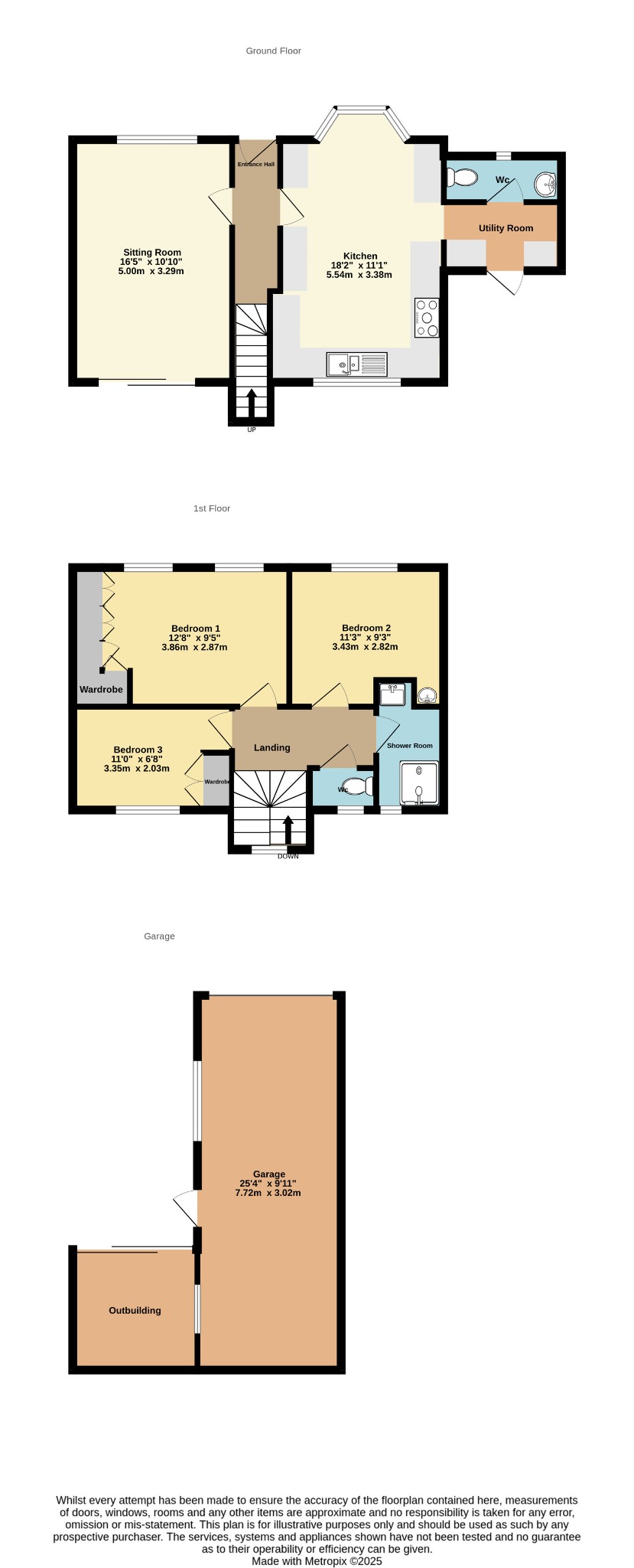 The front garden has a driveway providing off road parking for three vehicles. Gated pedestrian access to the rear garden. The rear garden is principally laid to lawn with patio seating area. Outside tap. Block built garage with attached outbuilding.