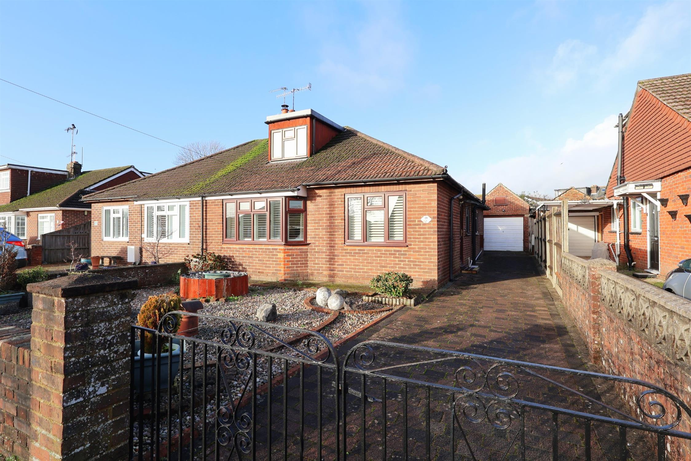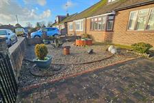Gated block paved driveway leading to garage, walled front low maintenance garden.