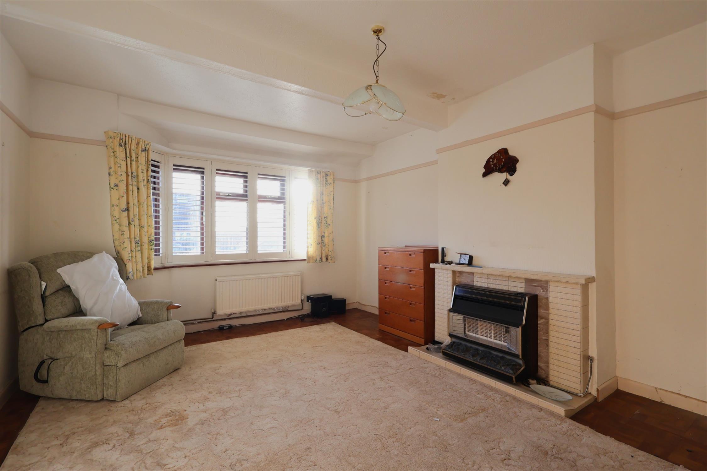 Textured ceiling with uPVC double glazed bay window to front with fitted shutters. Radiator. Fitted gas fire with tiled surround. Decorative parquet flooring around the outside of a rug inlay.