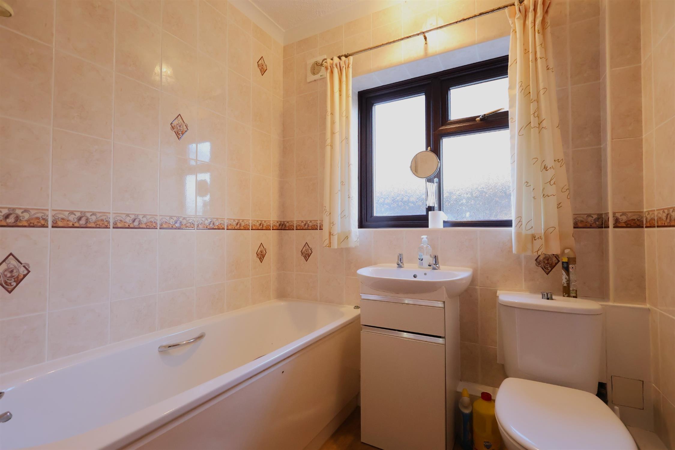 Textured and coved ceiling. Frosted uPVC window to side aspect. Suite comprises panelled bath with wall mounted shower controls and tiled walls, wash hand basin with storage drawers underneath, close coupled WC, ladder style heated towel rail and tiled walls.