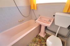 Opaque double glazed window to side, panel enclosed bath with mixer-tap shower attachment, pedestal hand basin, close-coupled WC.
