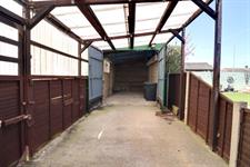 Long driveway to the side, lawned area with flowering shrubs, covered carport area leading to: