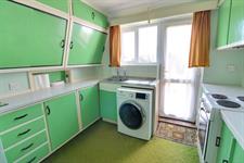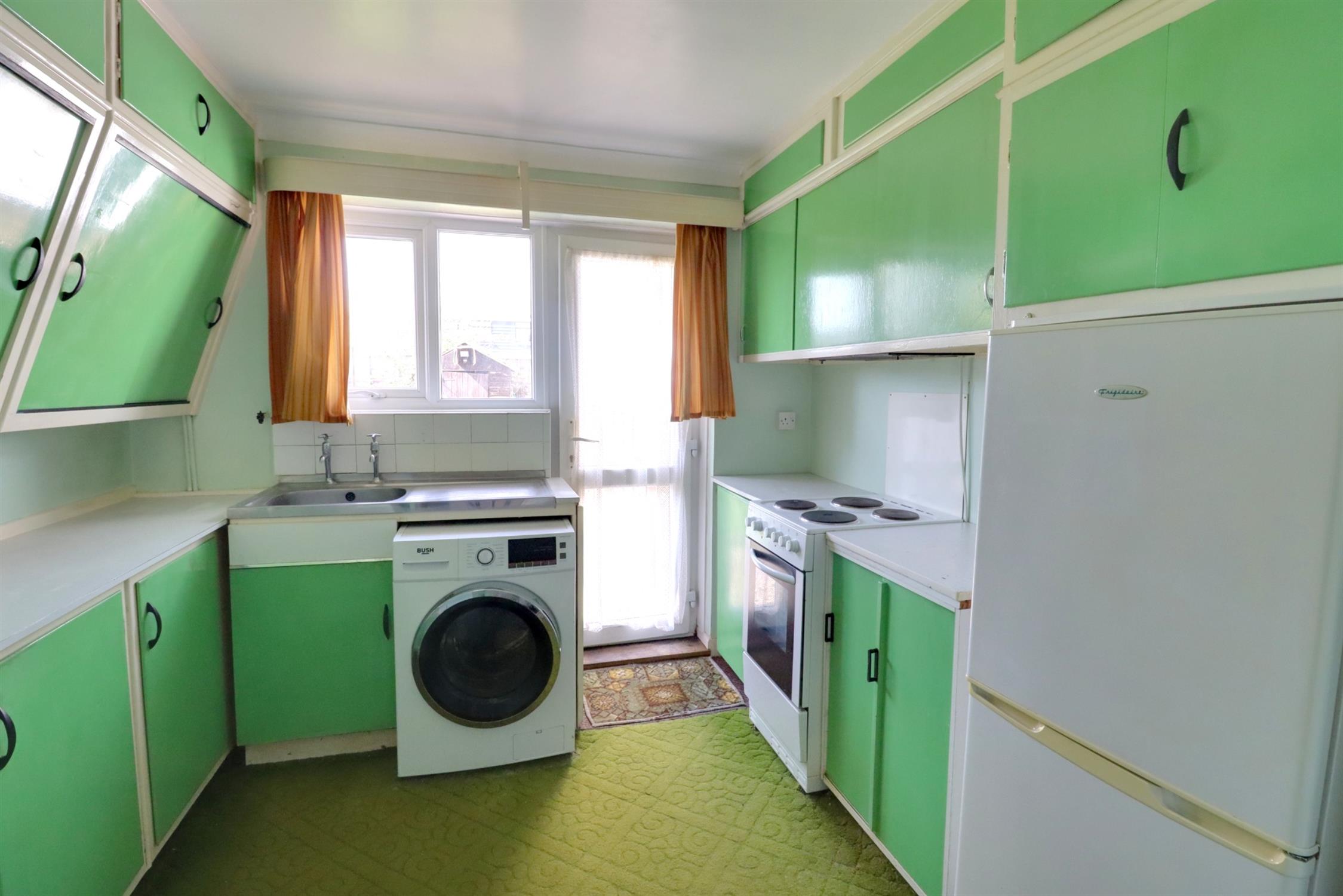 Double glazed window and door to rear garden, vintage Formica wall and base units with worktops over, stainless steel single bowl sink and drainer, electric cooker, washing machine, fridge/freezer. Larder cupboard housing electric meters, capped mains gas supply pipe, storage heater