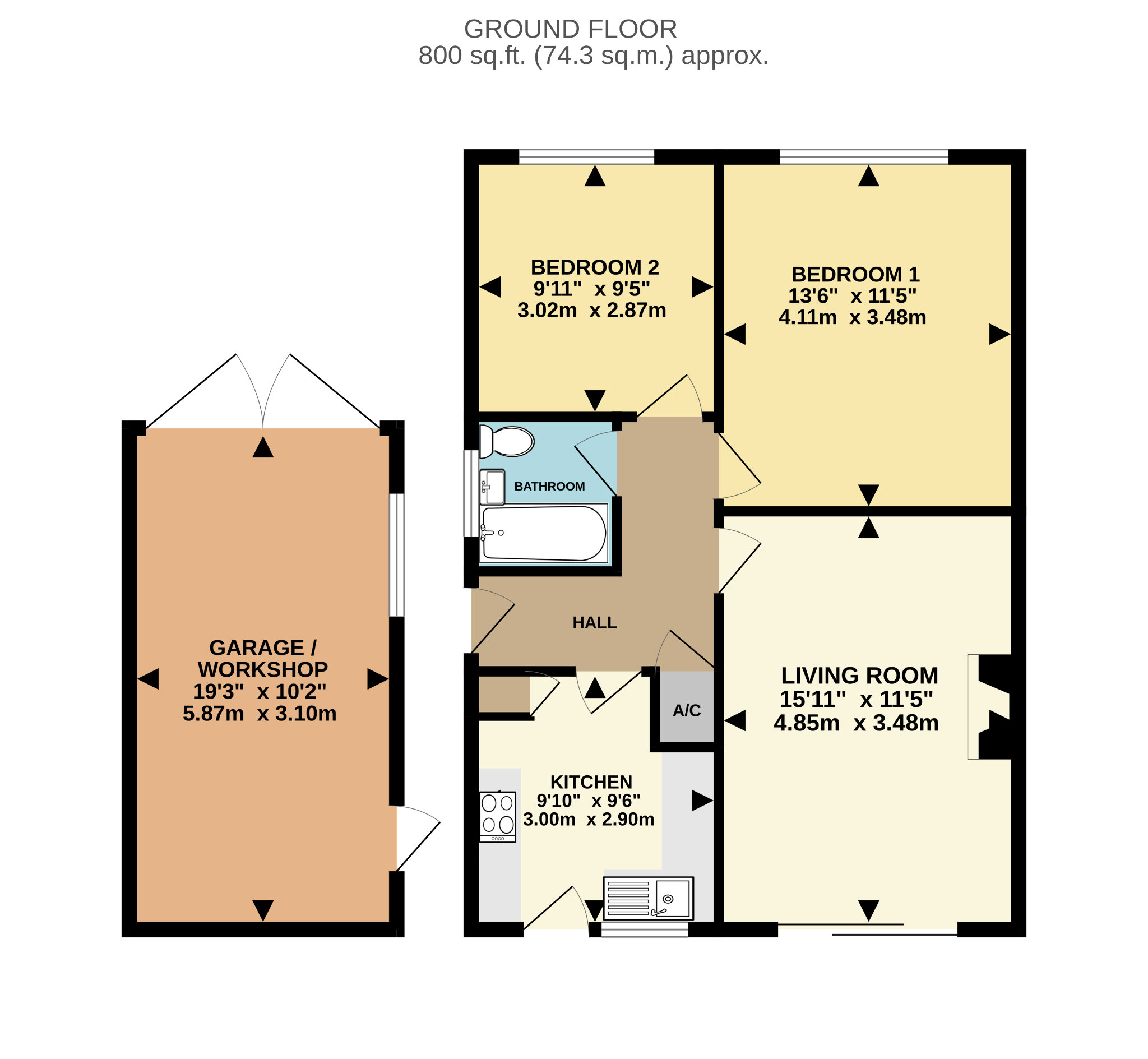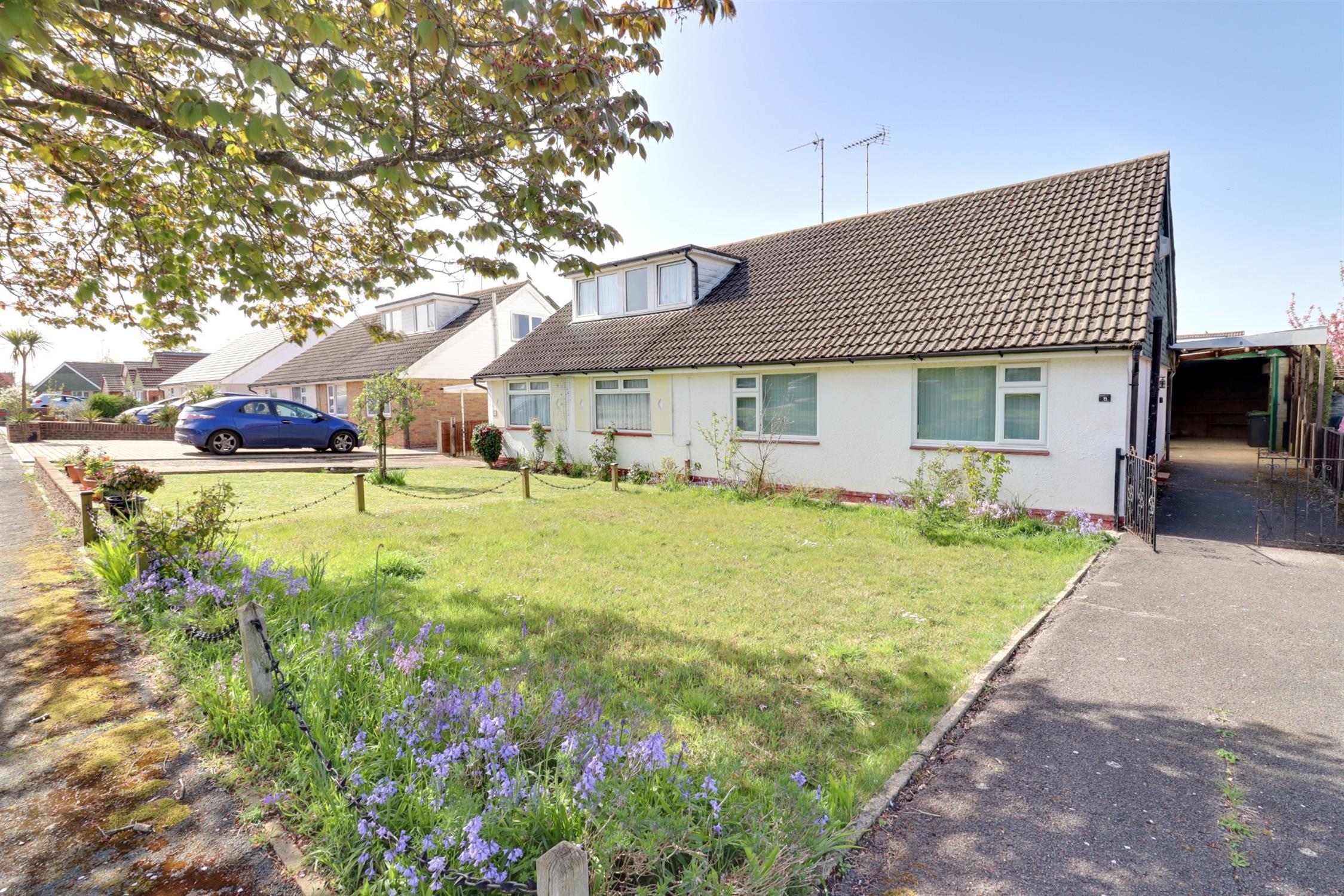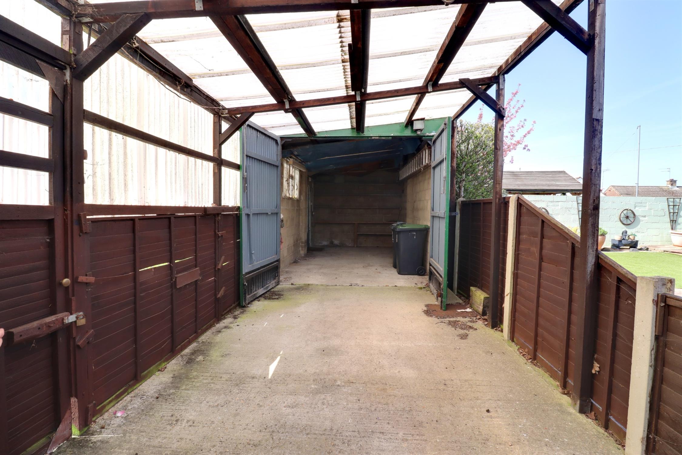A two-bedroom semi-detached bungalow requiring extensive modernisation and offered with NO ONWARD CHAIN. Situated in a popular cul-de-sac location, the property accommodation comprises: entrance hall, living room backing onto the sunny aspect rear garden, kitchen, bathroom and two double bedrooms. Front garden with long driveway to the side leading to a large, covered carport with access to a detached garage/workshop measuring 19ft 5 x 10ft 2.