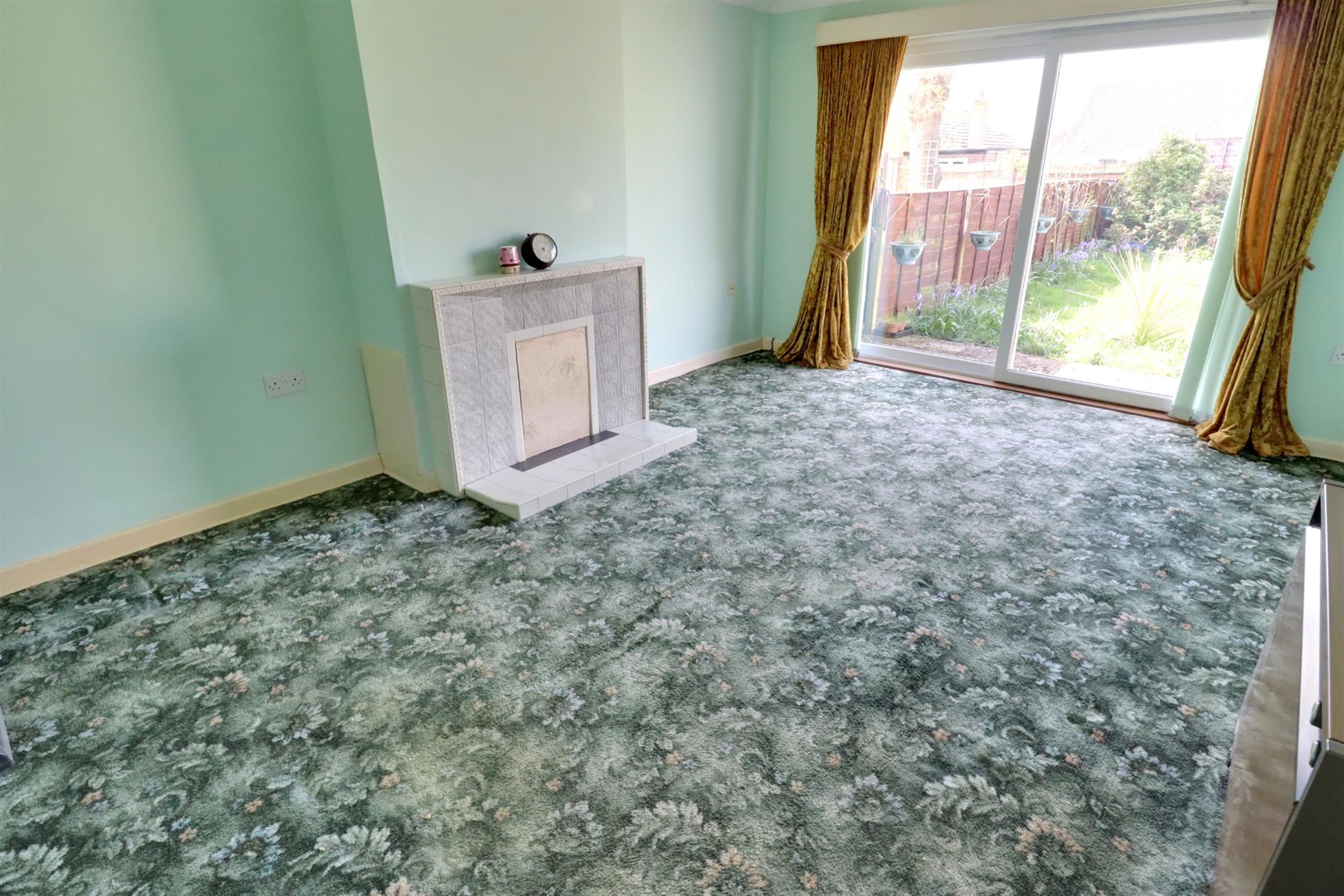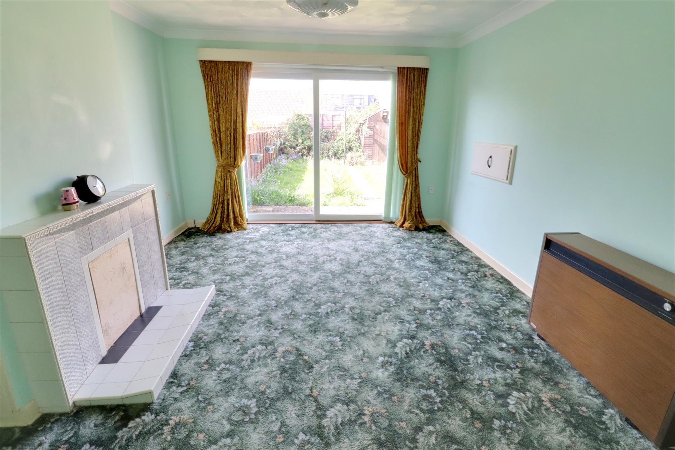 Double glazed sliding patio doors to rear garden, chimney breast with tiled hearth and surround, storage heater.