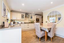 Coved ceiling, inset spotlights, double glazed window and double glazed doors to conservatory, range of wall and base mounted kitchen units with work surfaces over with inset stainless steel sink and drainer with mixer tap over, integrated appliances including 5 ring gas hob, double high level electric ovens, fridge freezer, dishwasher, washing machine and drinks cooler, radiator, tiled flooring.