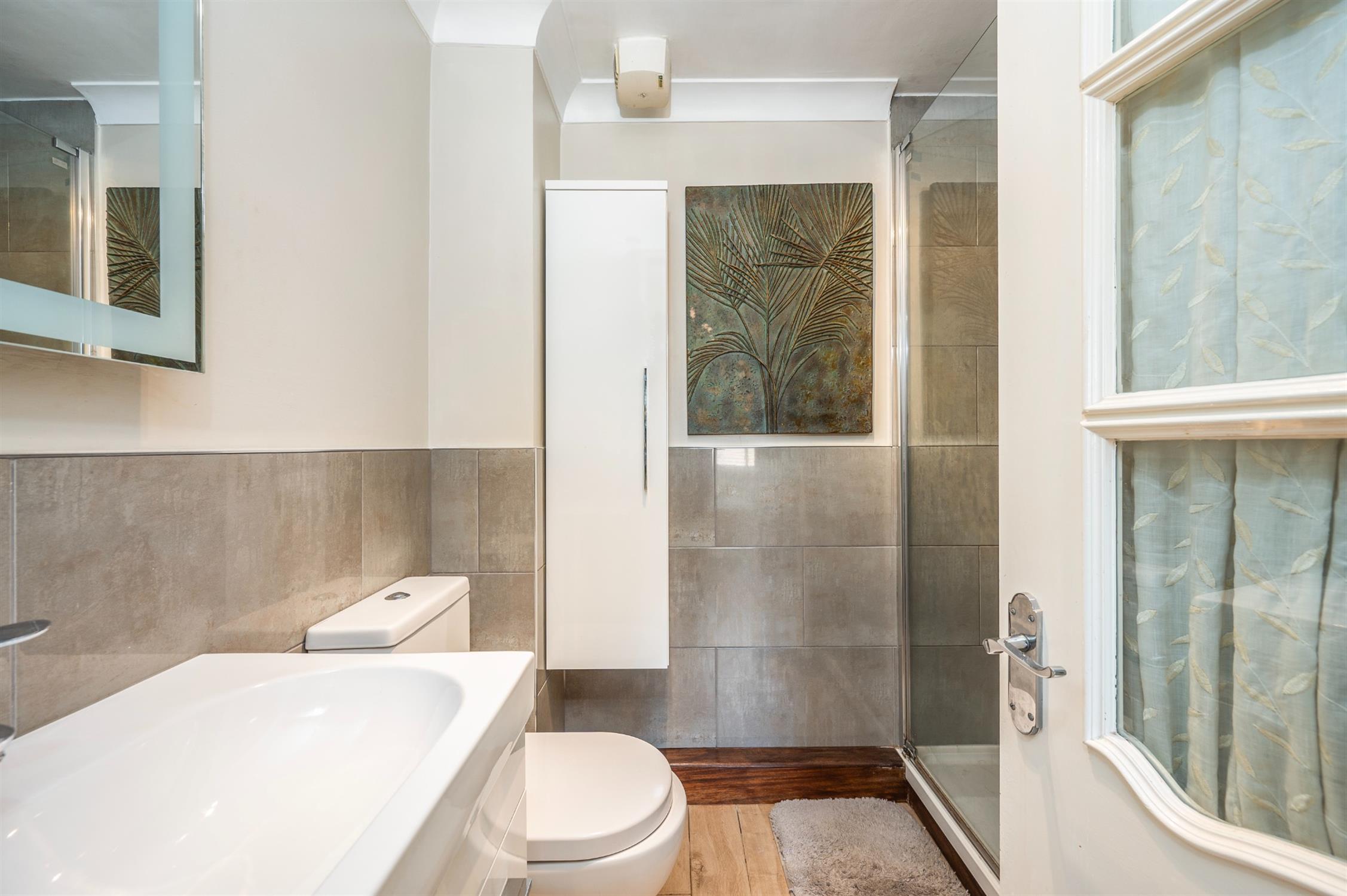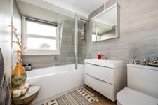 Coved ceiling, double glazed obscured window, panelled bath with shower over and screen, wash hand basin with cupboard beneath, WC, ladder radiator, part tiled walls, tiled floor.