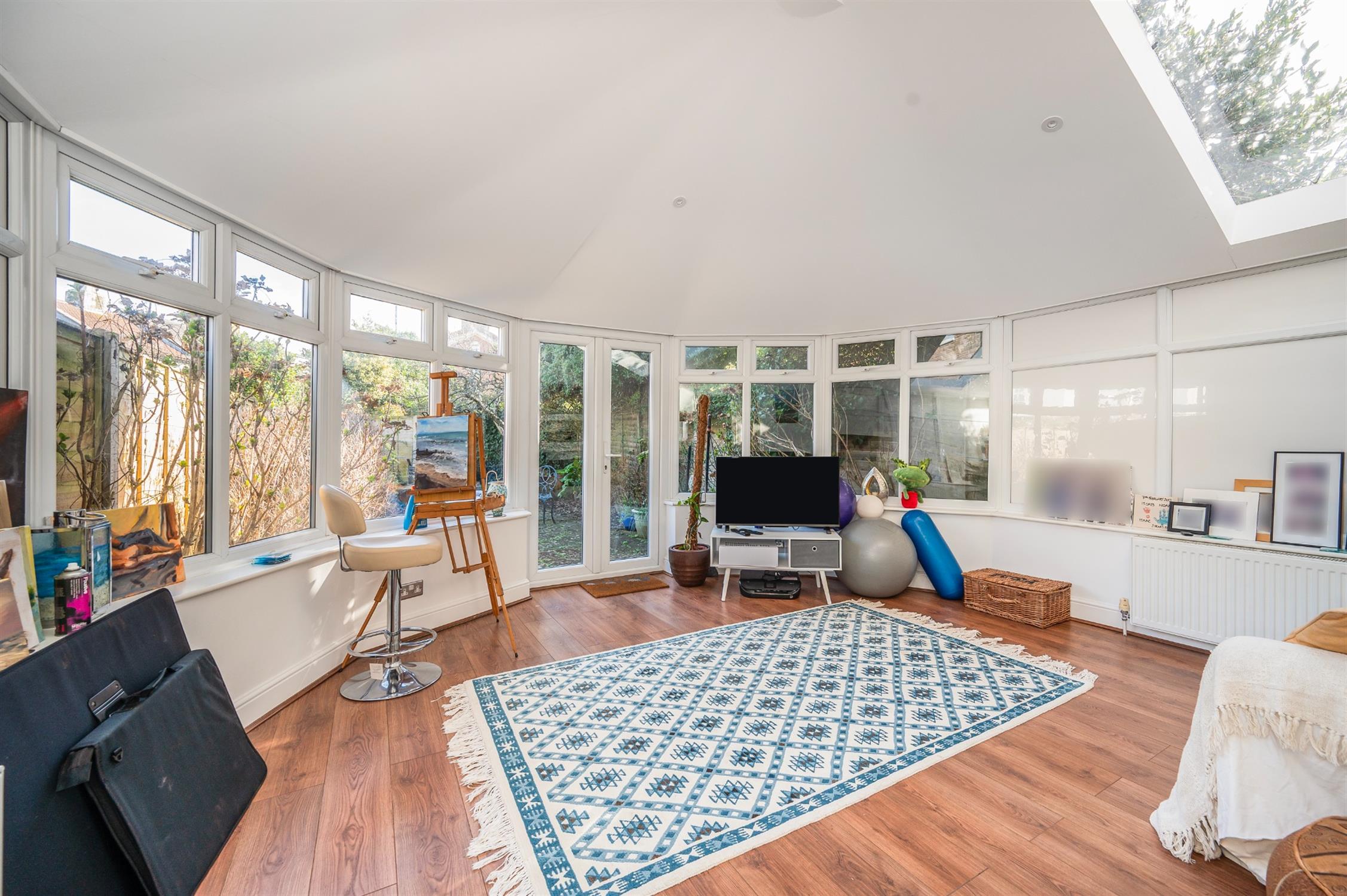 Double glazed windows and doors to garden, two roof windows, two radiators, laminate flooring.