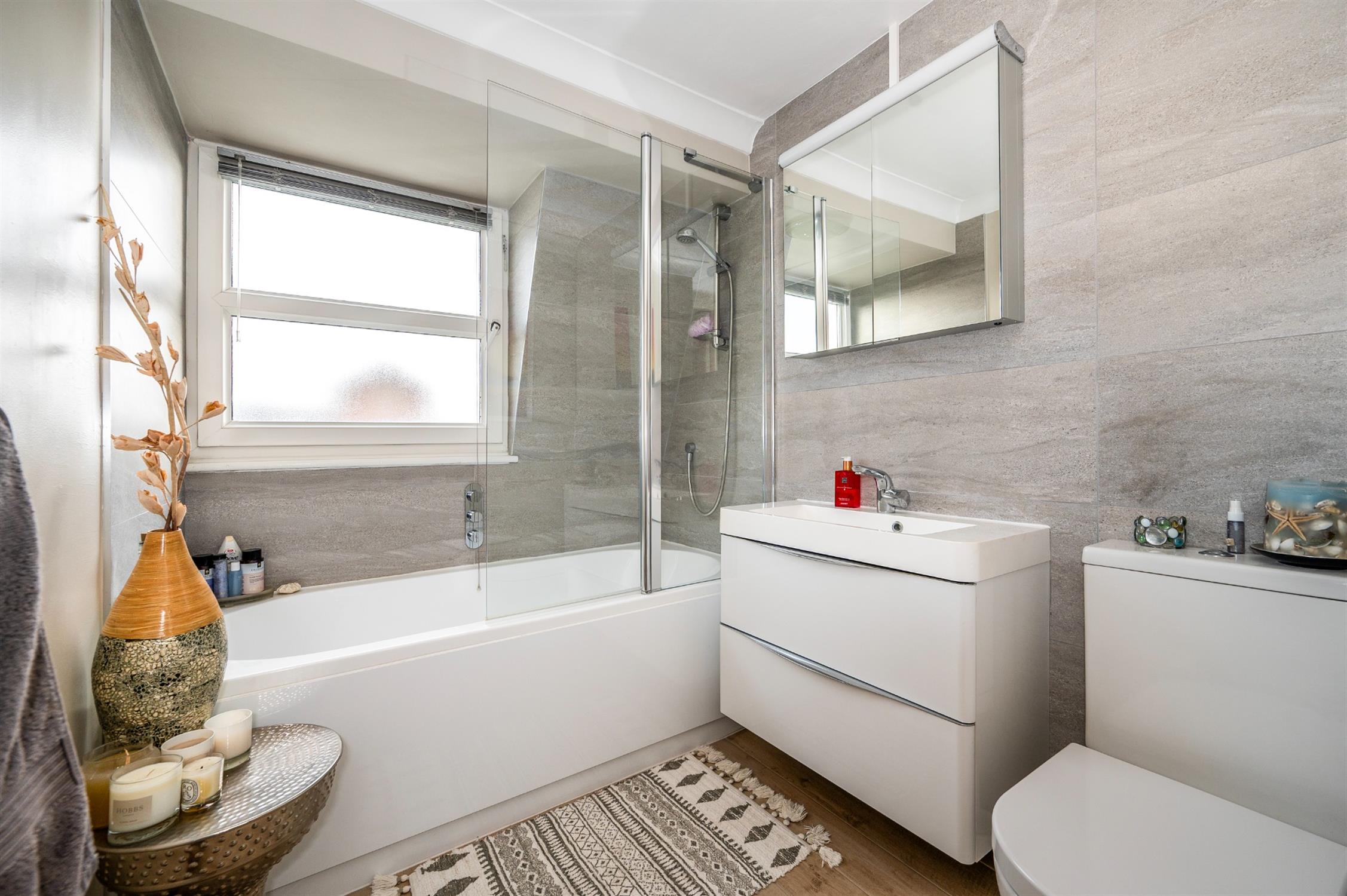 Panelled bath with mixer shower over and screen, WC, wash hand basin with cupboards beneath, ladder radiator, LED lit mirror, tiled walls, tiled floor.