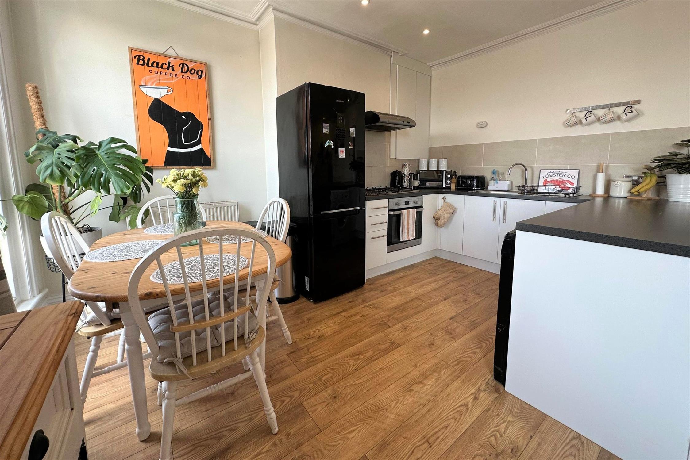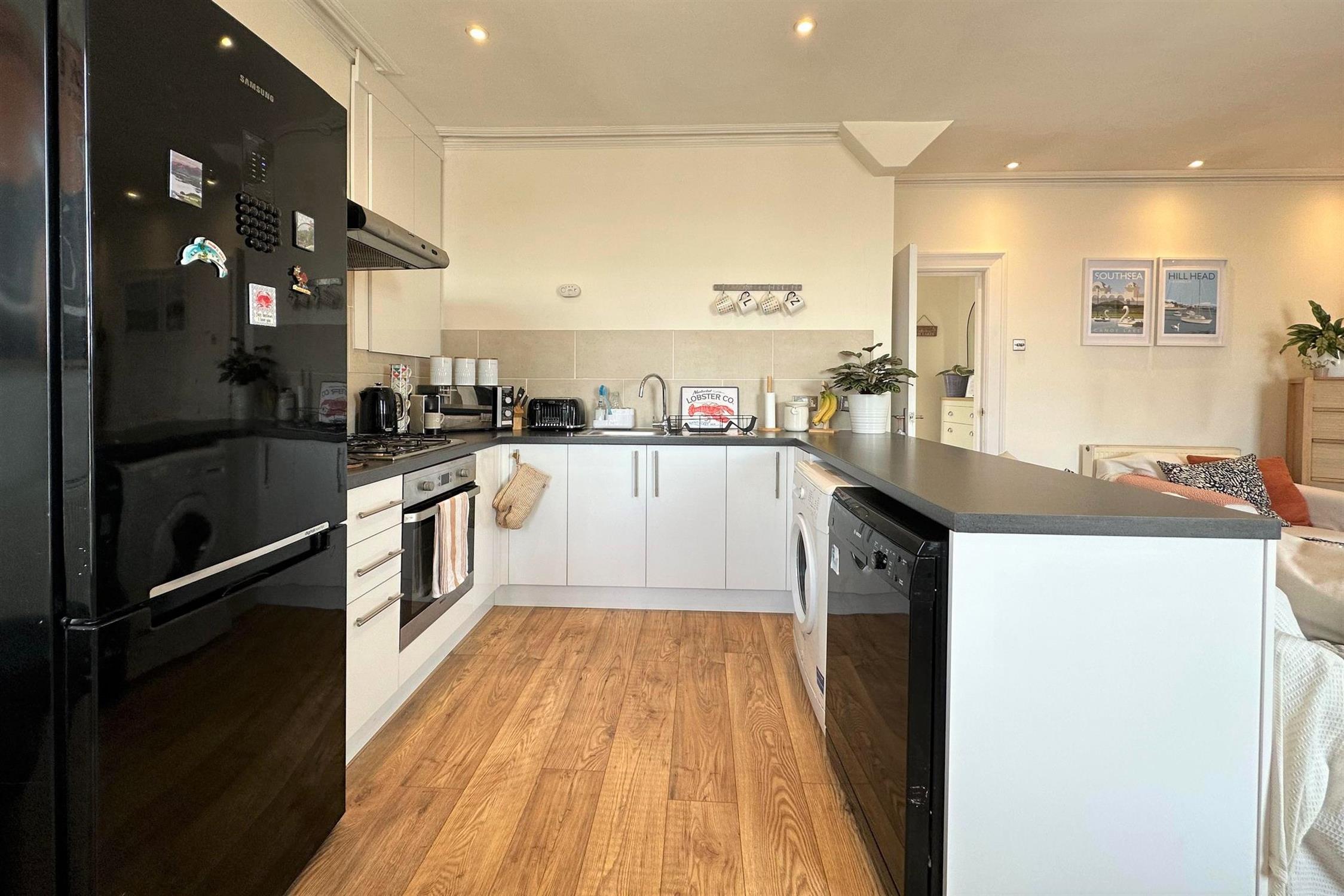 Fitted kitchen with electric oven & gas hob, freestanding fridge/ freezer, dishwasher & washing machine.