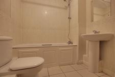 Tiled walls and flooring. Panelled bath with mixer tap shower over, ceramic wash basin. Smooth walls and ceiling. Extractor fan. Radiator.