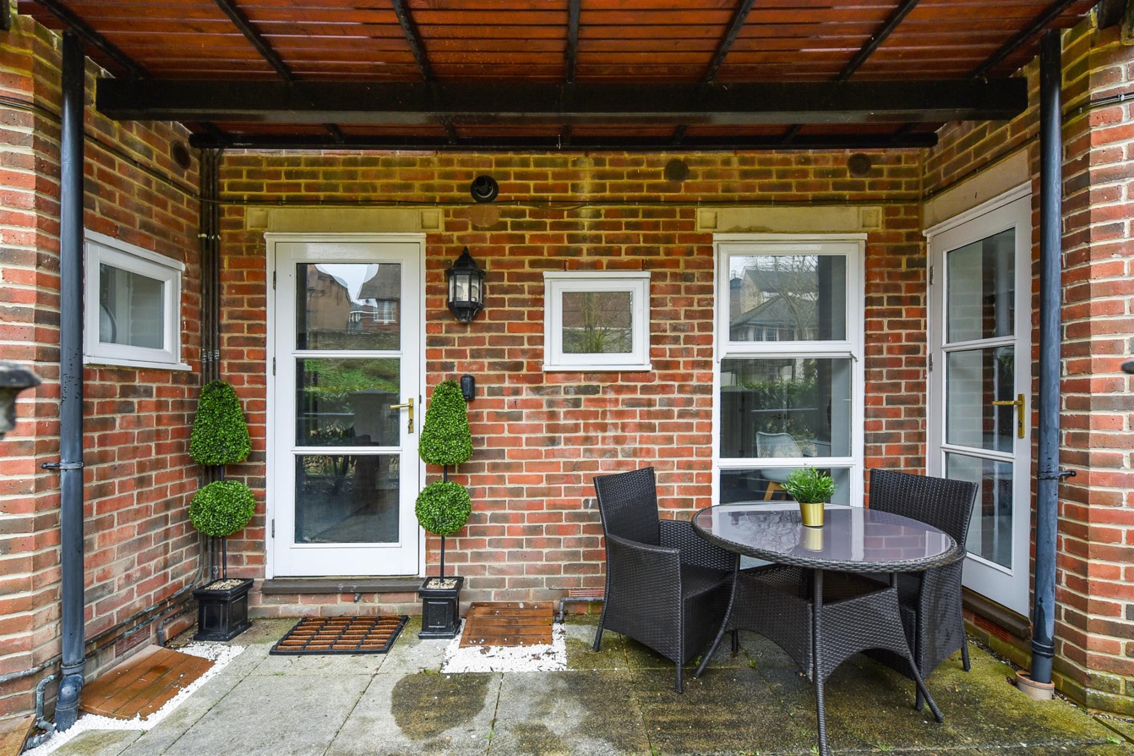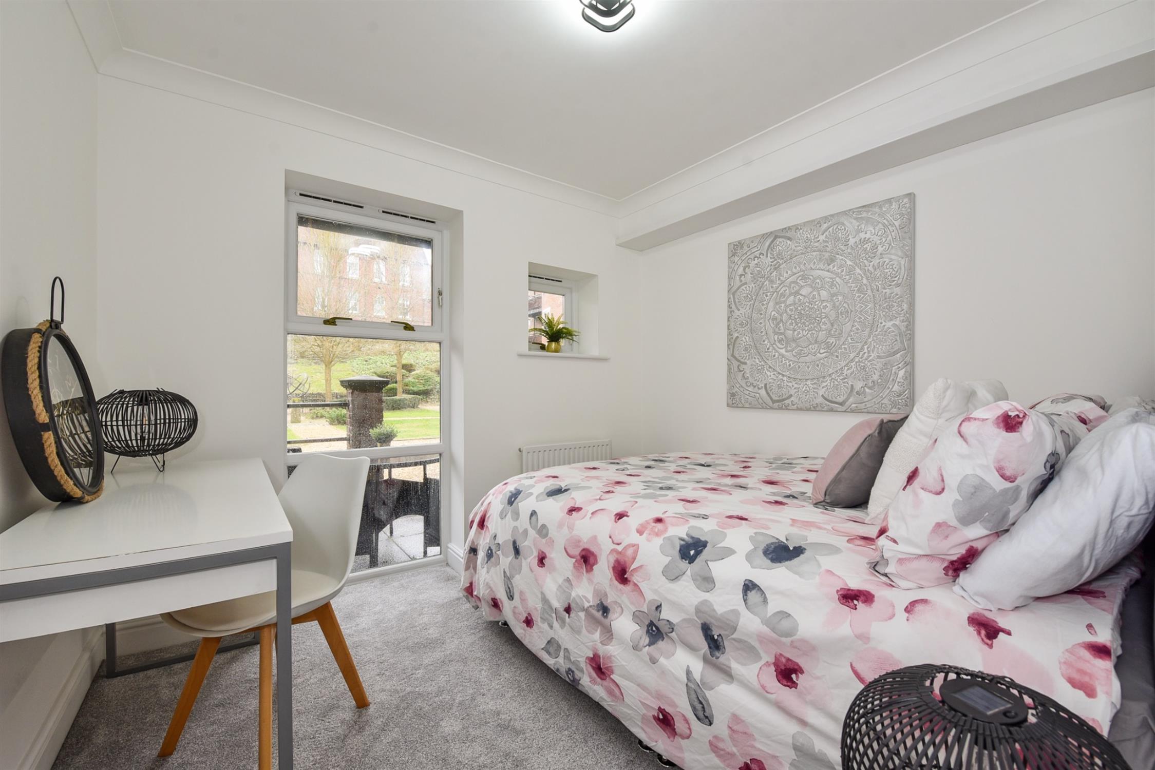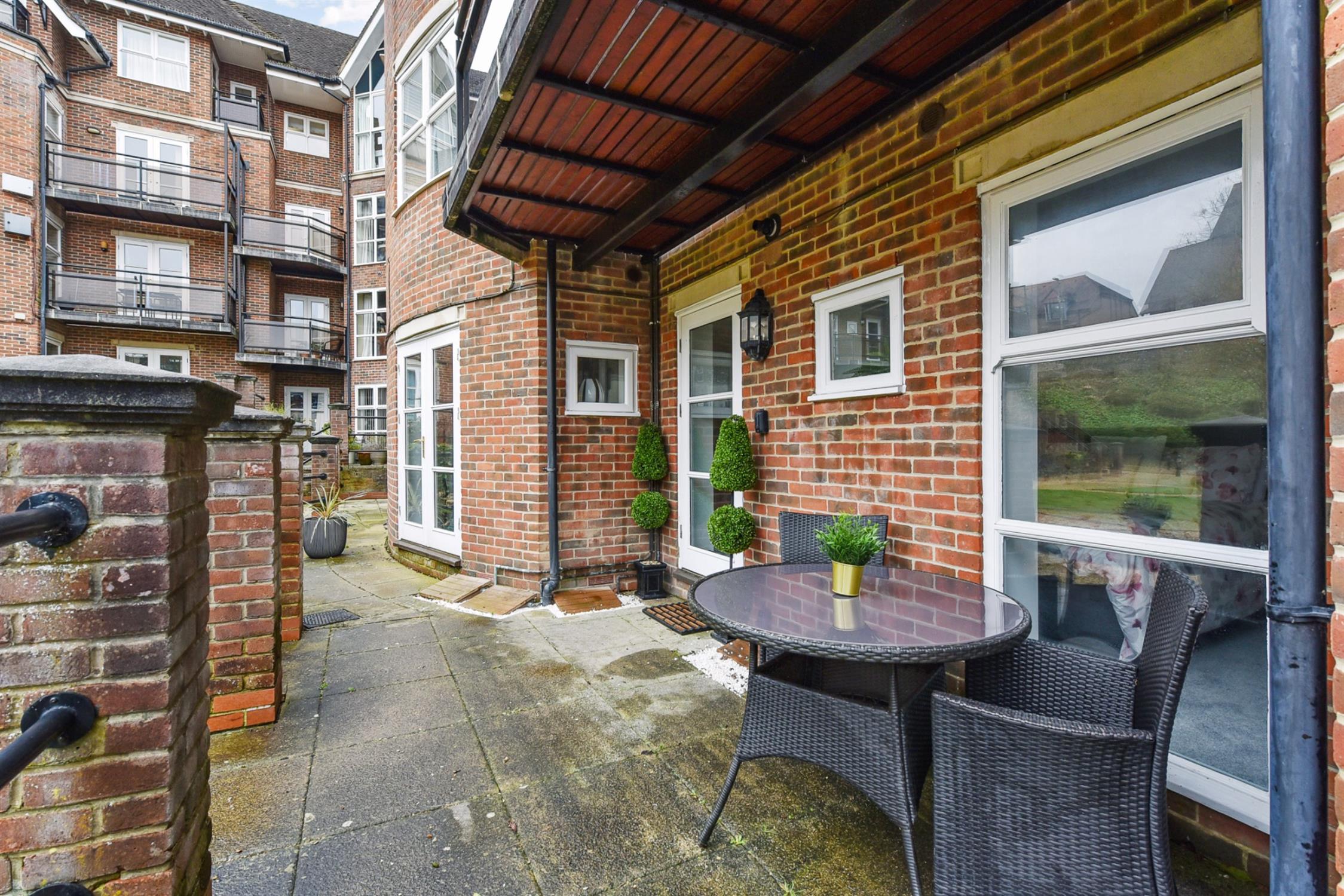 Both sets of French doors, as well as an additional back door in the living room, offer access to an outdoor patio and further to the impressively landscaped and well-maintained communal gardens which include a separate Jubilee garden with bench seating. Allocated residential and visitor parking is provided.