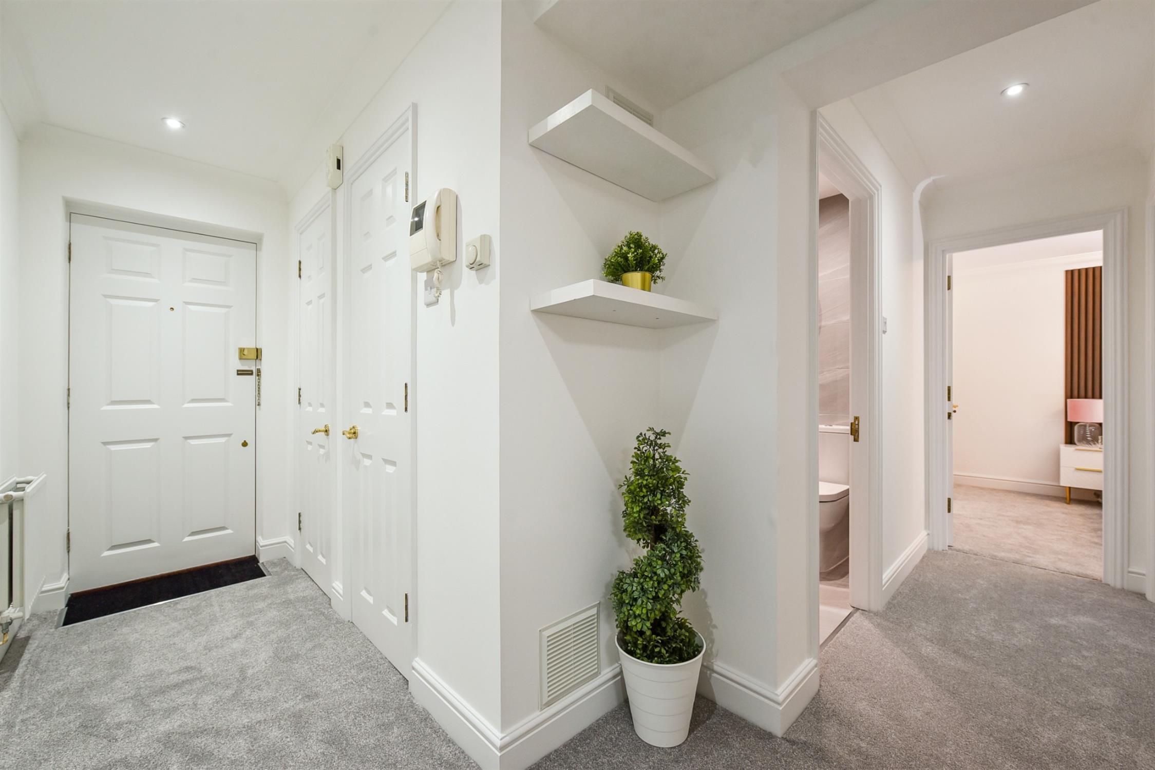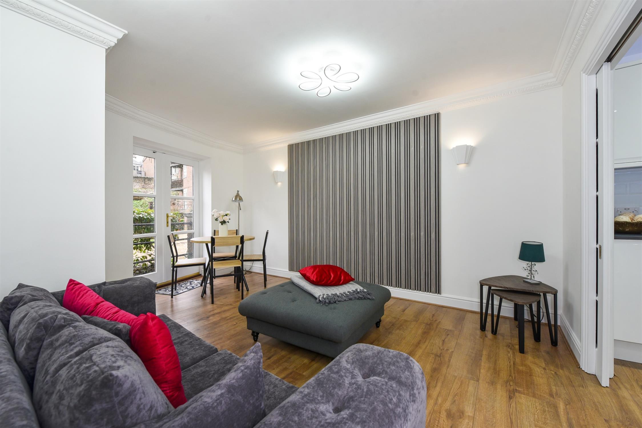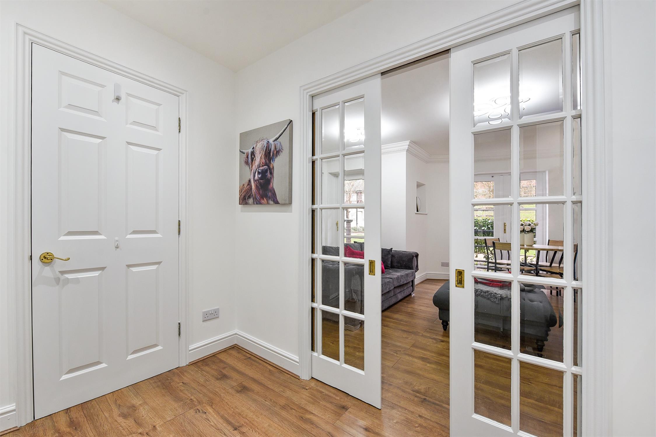 Both sets of French doors, as well as an additional back door in the living room, offer access to an outdoor patio and further to the impressively landscaped and well-maintained communal gardens which include a separate Jubilee garden with bench seating. Allocated residential and visitor parking is provided.