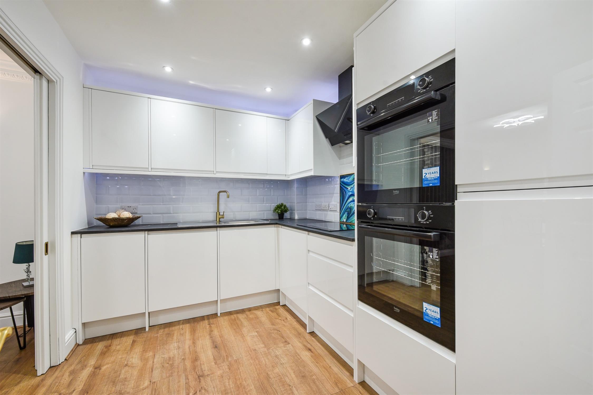 The communal entrance hall has stairs and a lift to all floors, with the apartments private entrance hall offering two large built-in storage cupboards. The kitchen is modern and bright, fitted with a range of integrated appliances, including an induction hob, and glass sliding doors allow access the living area. The living/dining room is L-shape and open plan, with French doors allowing ample light into the space. The generous master bedroom offers built in storage and benefits from a further set of French doors to the patio. Bedroom Two is a double and has a large floor to ceiling window as well as a further window to the southerly aspect. The ensuite is fitted with a shower, basin, toilet and heated towel rail, and the second bathroom is fitted with a bath, toilet and basin.