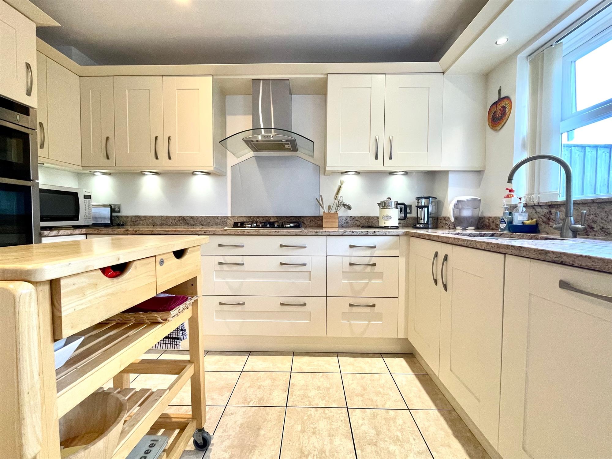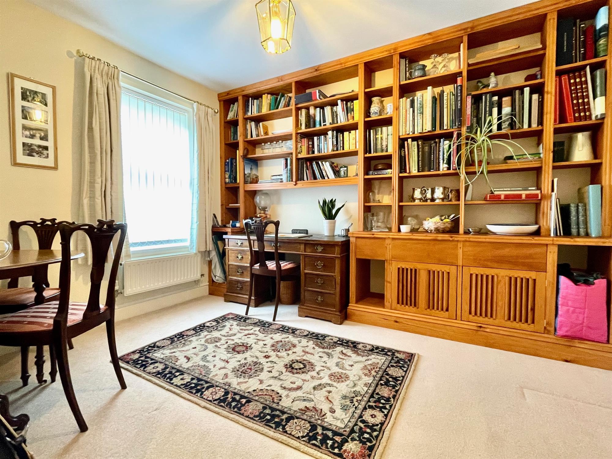What is immediately apparent is the classic presentation of the property, decorated in neutral tones with some lovely character features. The property benefits from two reception rooms, one of which is located on the ground floor and is currently used as a well-appointed study with attractive timber carpentry. The kitchen spans across the width of the property and is fitted with a range of eye and low-level cream shaker style units with figured granite worktops and a range of integrated appliances including double oven, fridge/freezer and gas-ring hob. The room offers further space for a dining area and double doors also open to the rear garden. Finishing off this floor is a shower room with toilet and handbasin, and a built-in storage cupboard under the stairs.