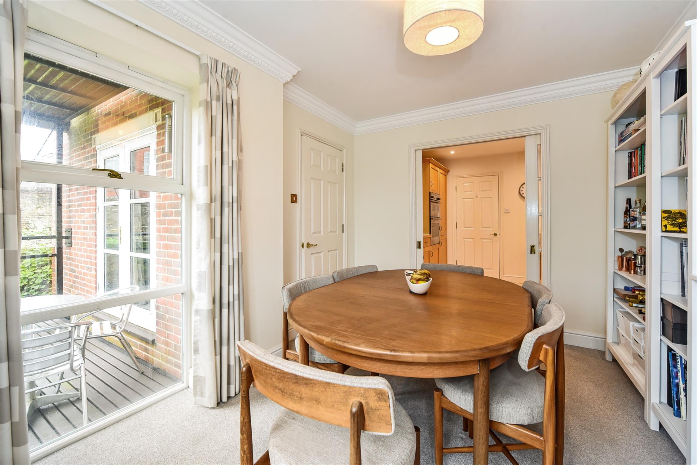 A similarly lovely space, with curved wall and large windows overlooking the grounds. Pocket doors lead to the kitchen.