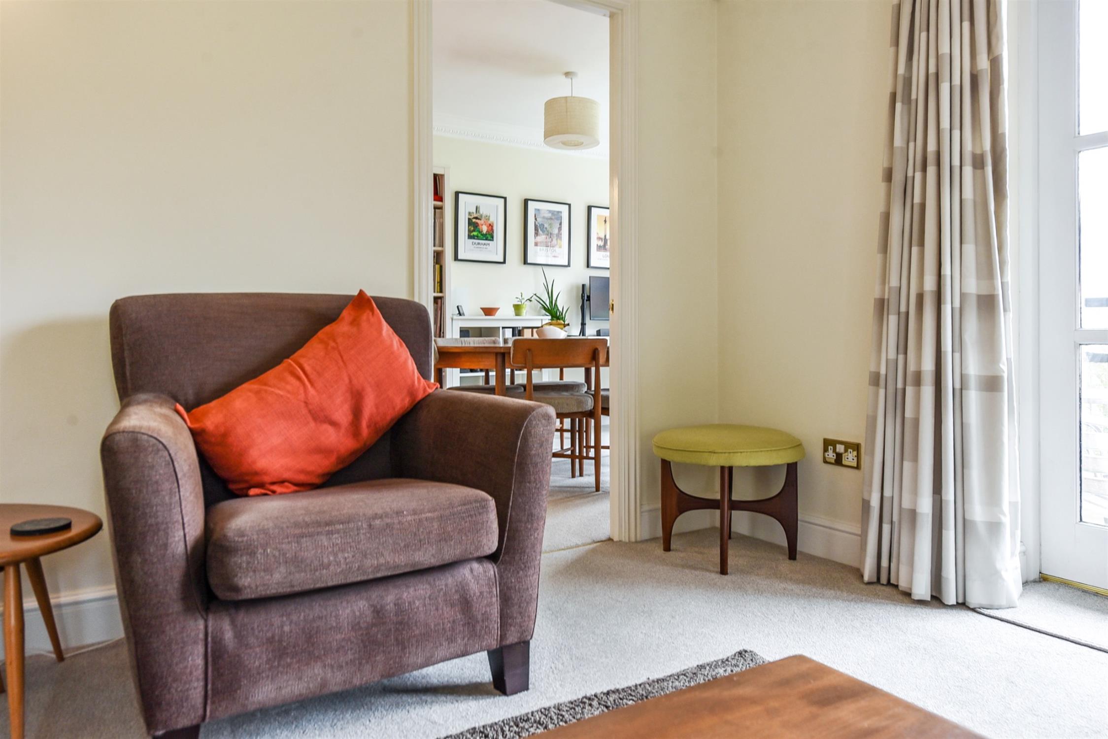 A really homely double-aspect space, with curved bay window, double doors opening onto balcony and door to dining room.