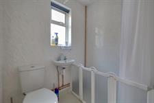 Smooth plastered ceiling with inset lighting. Frosted uPVC window to side aspect. Close coupled WC and wall mounted wash hand basin. Walk-in shower with wall mounted electric shower and control unit, tiled walls. Screeded floor with floor drain.