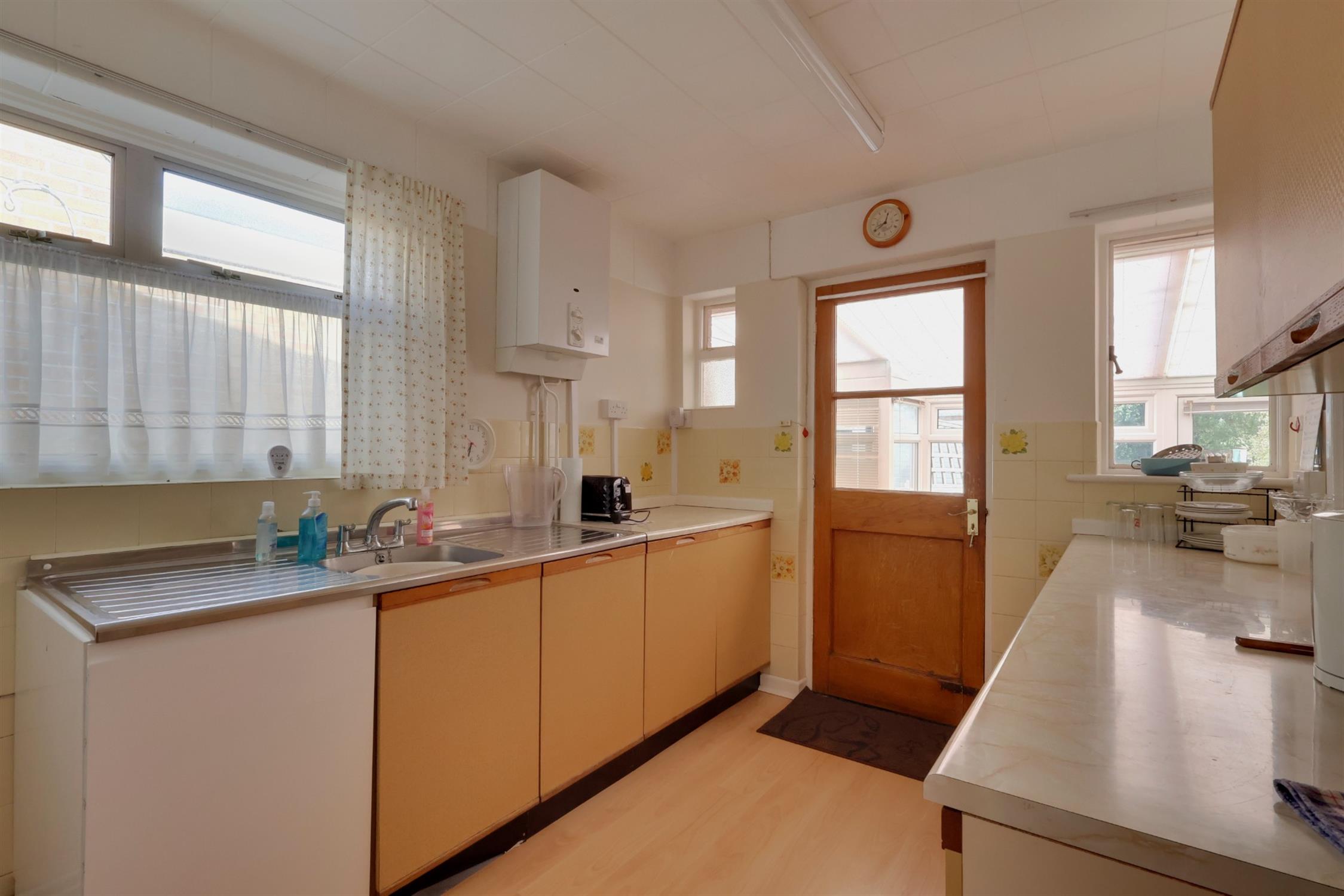 Double glazed aluminium frame window to side aspect. Wooden glazed door leading to conservatory. Wall mounted water heater. Various floor, wall and drawer units. Stainless steel sink/drainer set in laminated worktop.