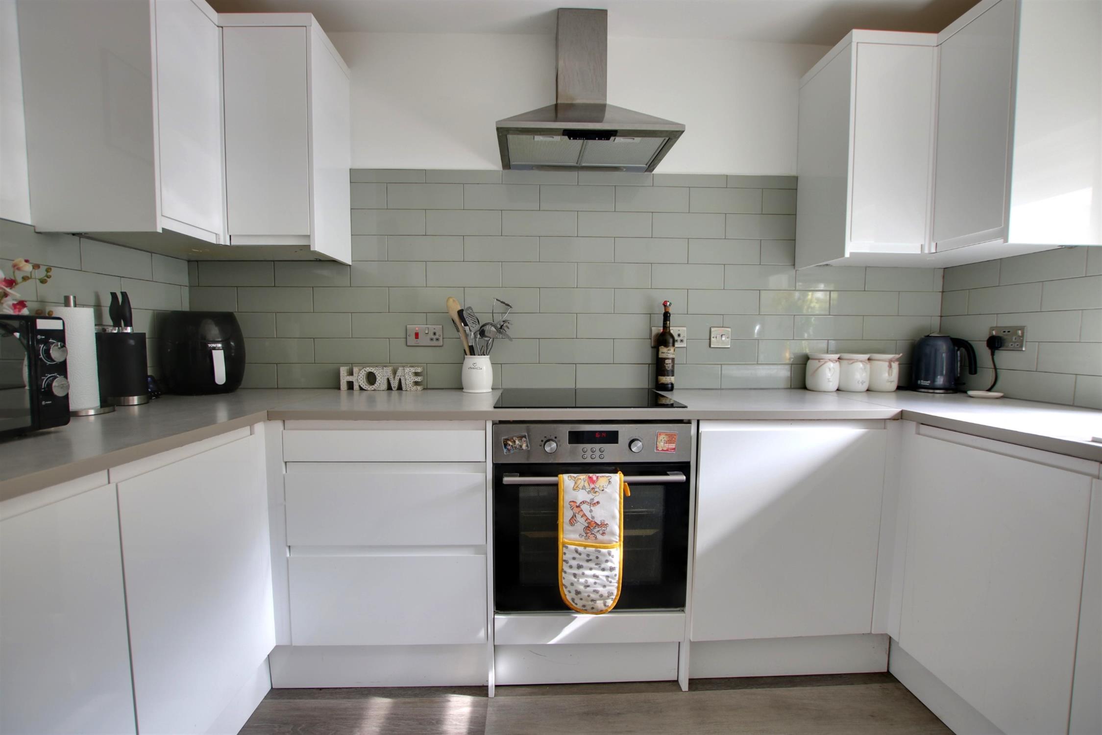 Double glazed window to front aspect. Smooth ceiling with recessed lighting. Single drainer sink unit with mixer tap and cupboard under. A range of matching eye level and base mounted units. Built-in oven with fitted four ring induction hob and extractor over. Integrated fridge/freezer and washing machine. Space for slim line dishwasher. Laminate flooring.