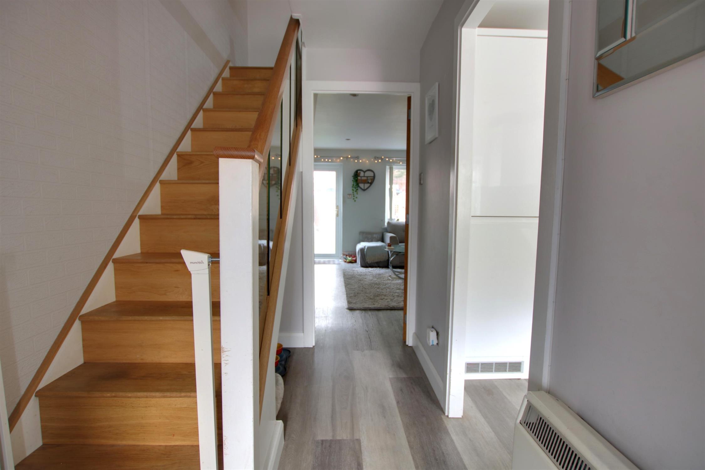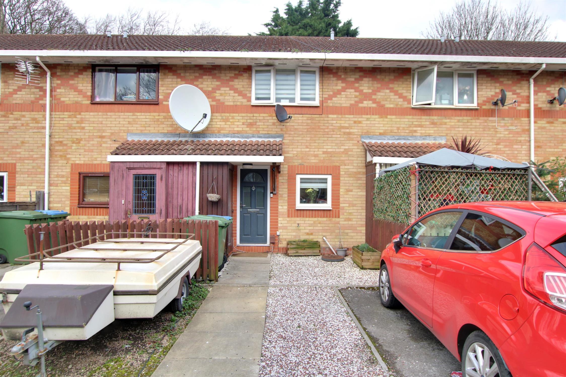 The front garden has an off road parking space. Path to main entrance door. Storage cupboard.