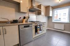 Range of base and eye level units, electric oven with gas hob over, extractor fan, space for dishwasher, washing machine and fridge/freezer, tiled flooring, smooth plastered ceiling, inset spotlights.