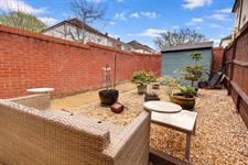 Sunny aspect garden, patio area with stoned section, shed, side access via gate.