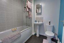 A three-piece suite consisting of a panelled bath with overhead shower, tiled splash back, ceramic sink with chrome mixer tap and vanity unit, low-level WC, tiled flooring, smooth plastered ceiling.