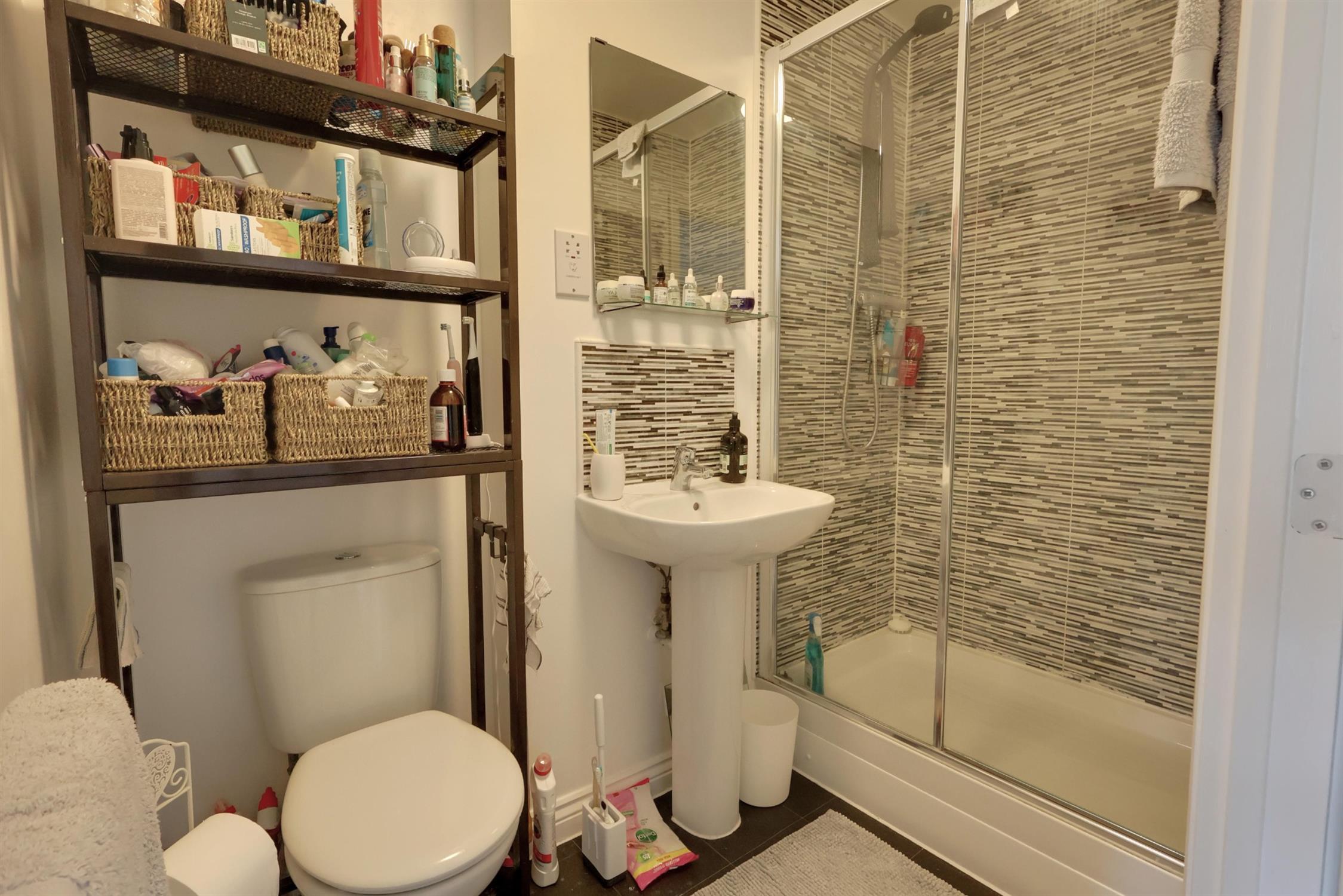Three-piece suite consisting of a walk-in shower unit with tiled splash back, ceramic sink with chrome mixer tap, low level WC, tiled flooring, radiator.