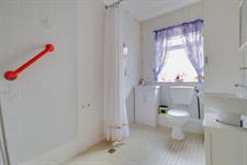 Obscure uPVC window to side. Close coupled WC. Two hand basins. Wall mounted shower controls with tiled walls and floor incorporating floor drain.