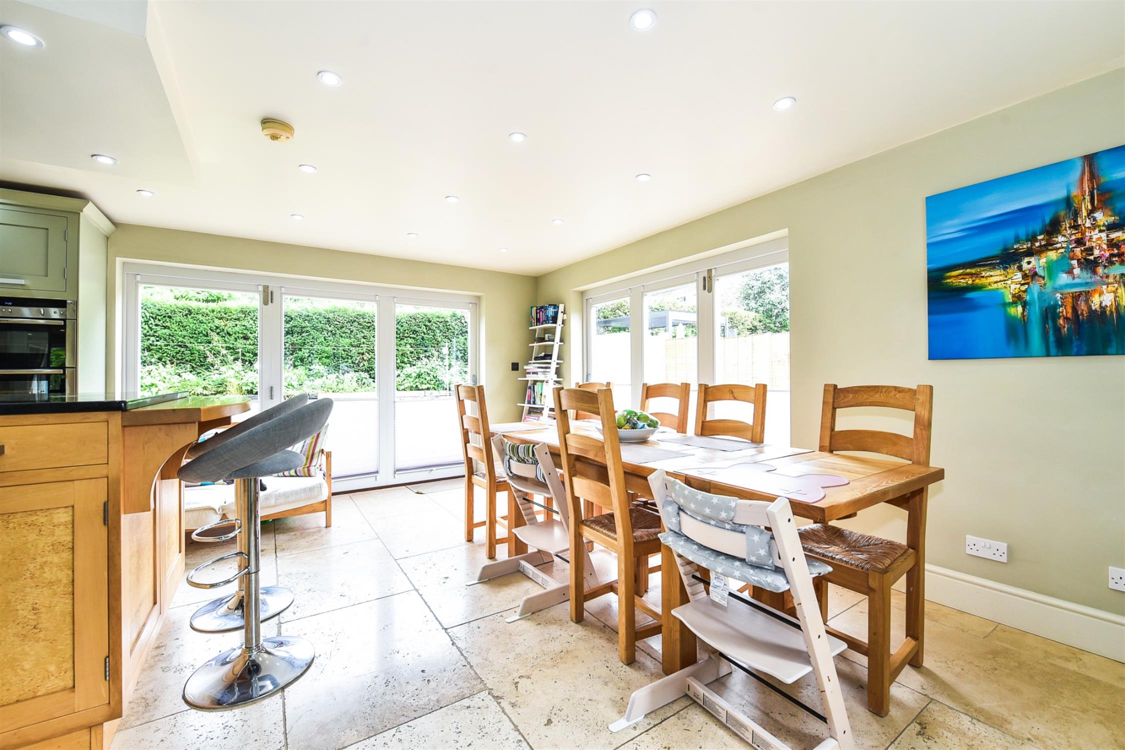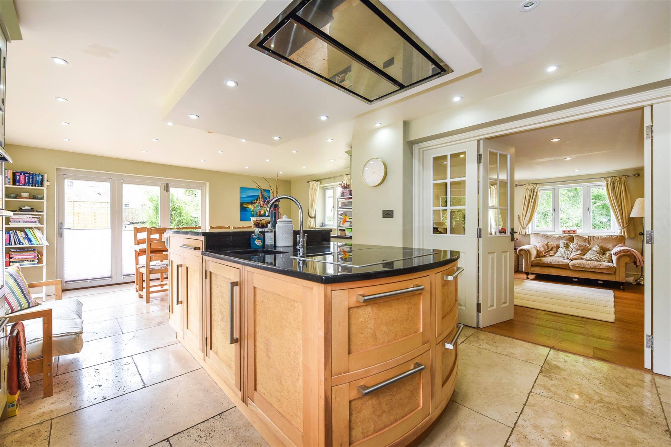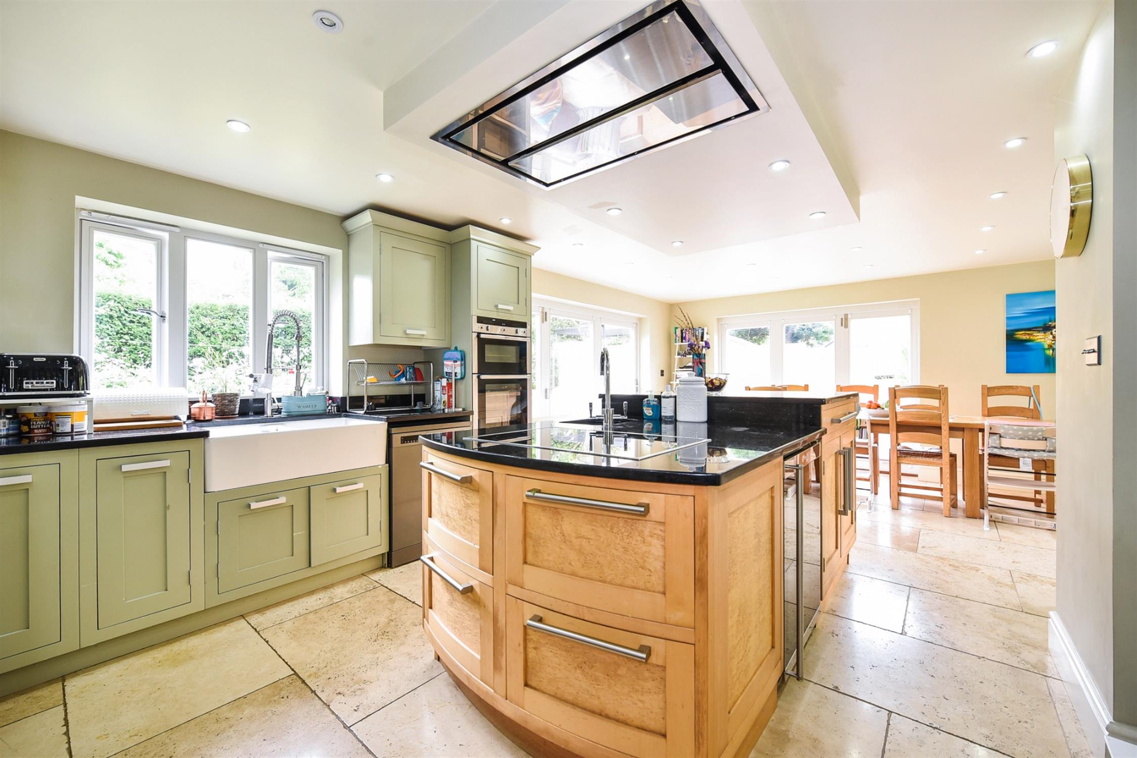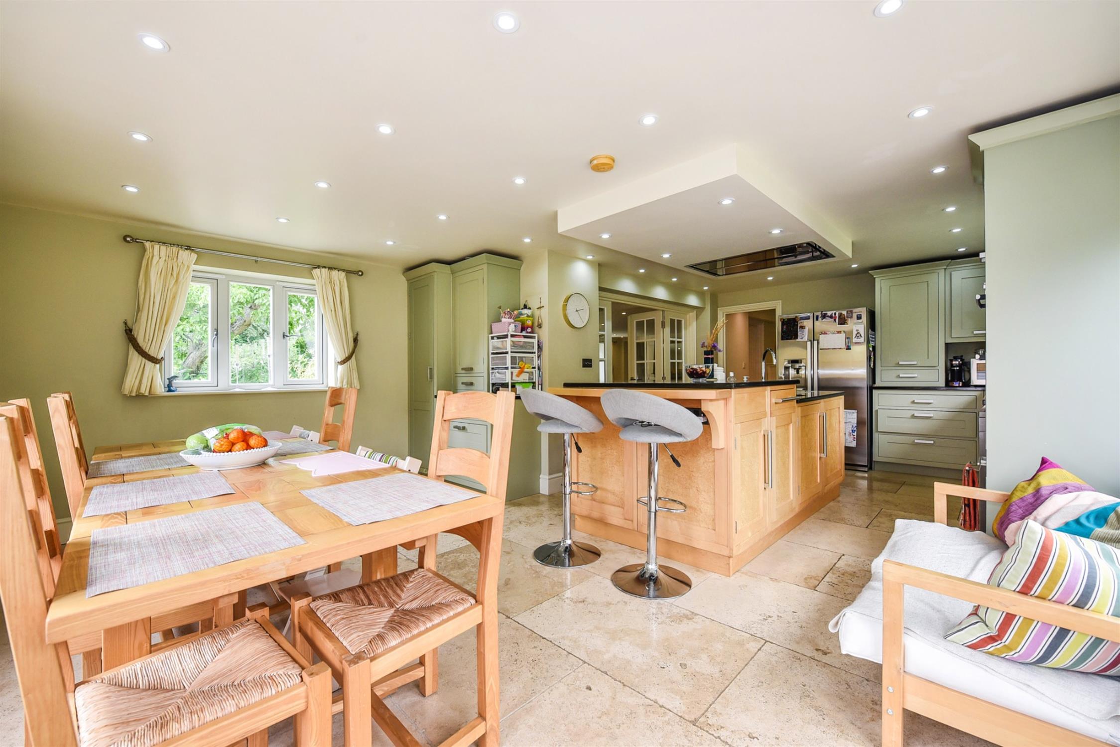 Attractively fitted with a range of units with Granite worksurfaces over. Incorporating a double Belfast sink with mixer tap over. Oven housing with Neff oven. There is a large central island unit which incorporates a breakfast bar, along with further storage cupboards and drawer units under, Granite worksurfaces over, Miele electric induction hob and additional stainless steel sink with mixer tap over. There is plenty of space for living and dining, complimented with a stone tiled floor and two sets of bi-folding doors which open out onto the rear and side paved terrace area. Underfloor heating. Space for fridge/freezer and dishwasher.