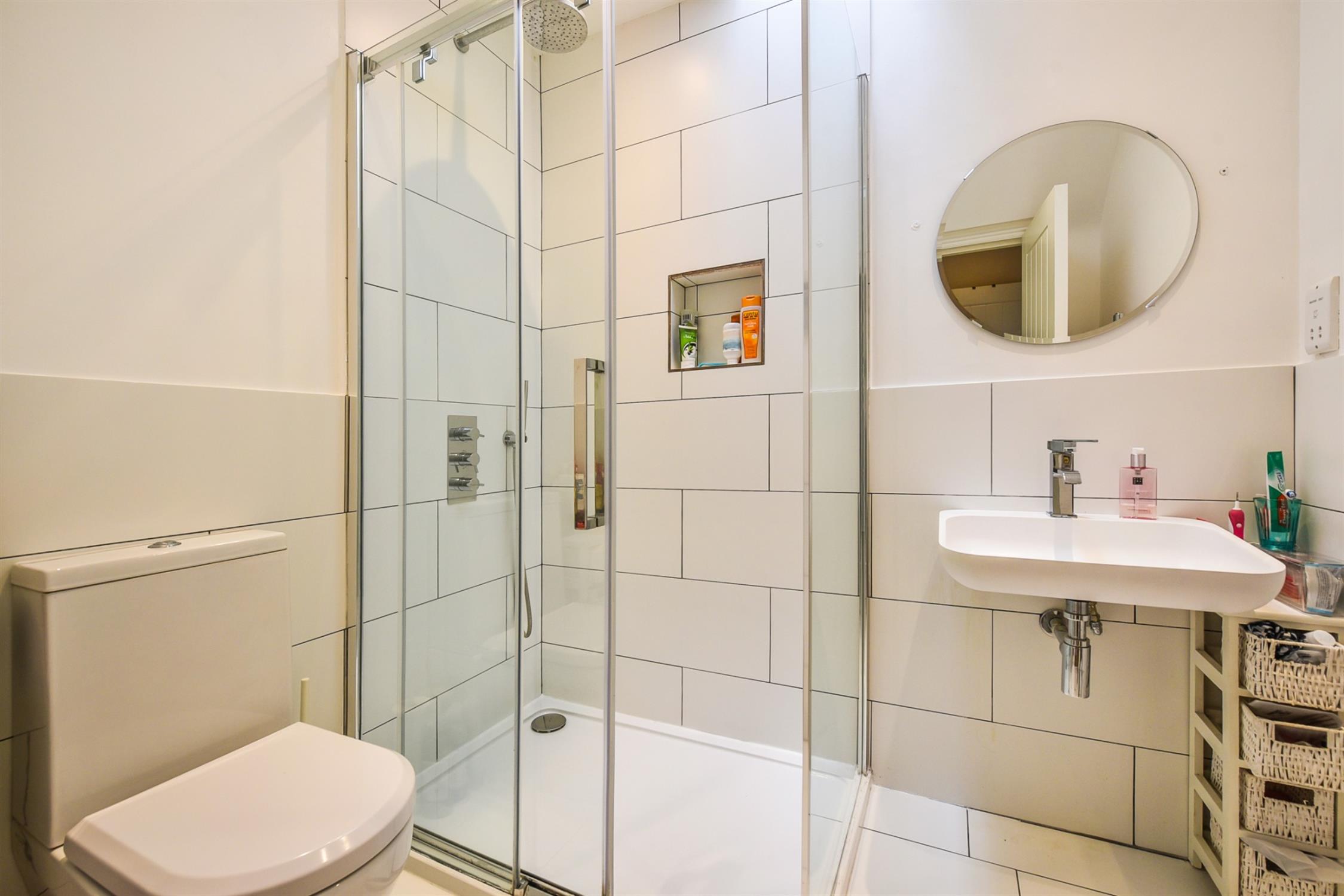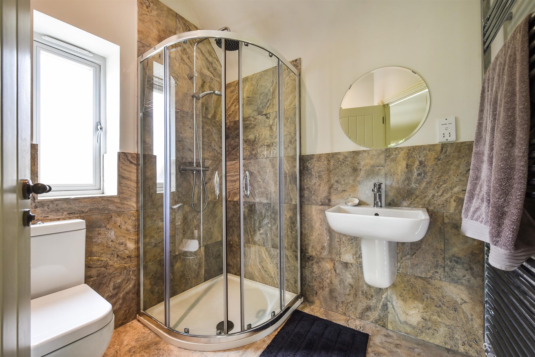 Tiled shower cubicle, WC and wash hand basin, mirror and shaving point. Double glazed window to the side aspect. Heated towel rail. Inset lighting.