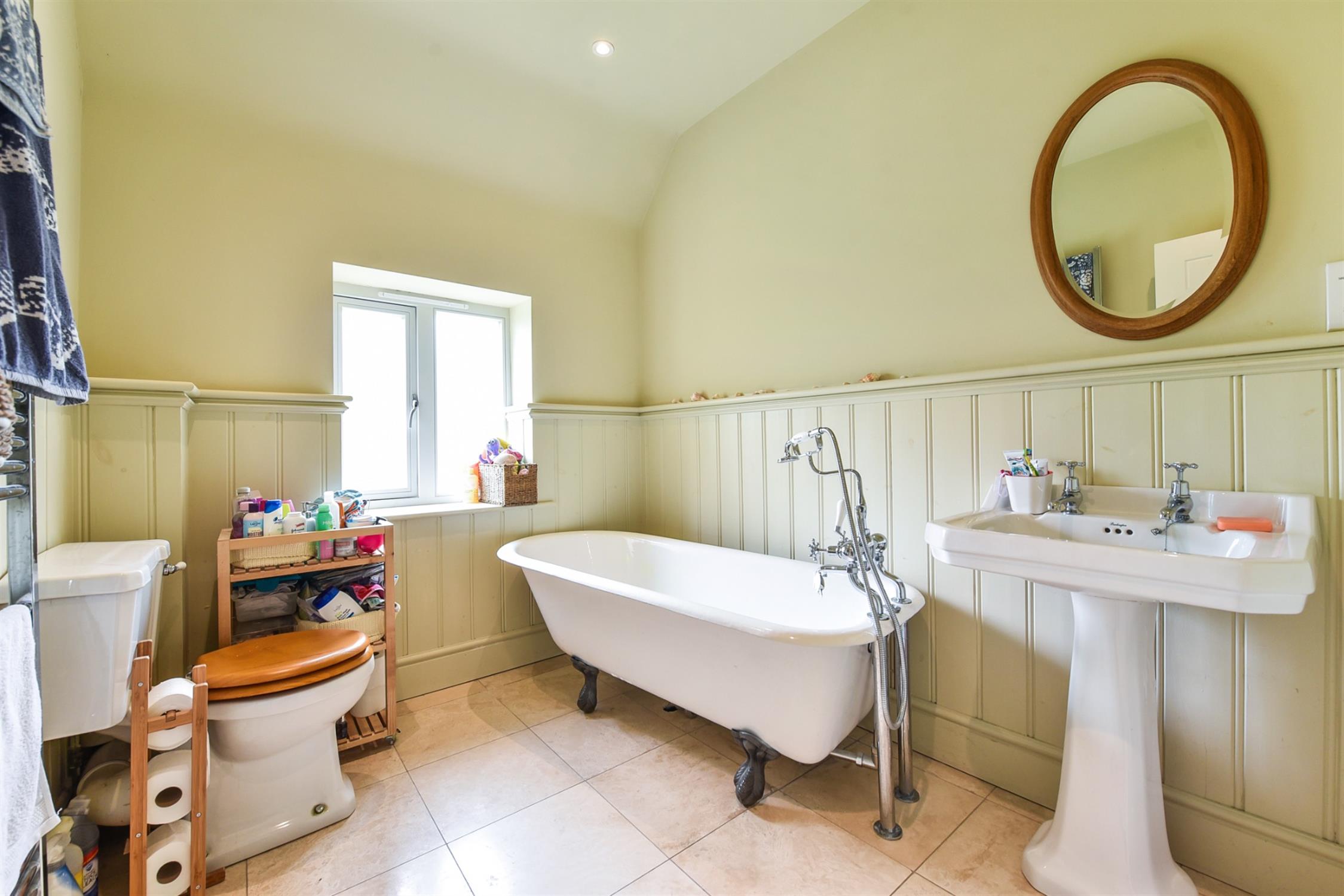 Fitted with a white suite incorporating a free standing claw foot bath, WC and traditional style pedestal wash hand basin. Tiled floor. Heated towel rail and double glazed window to the rear aspect.