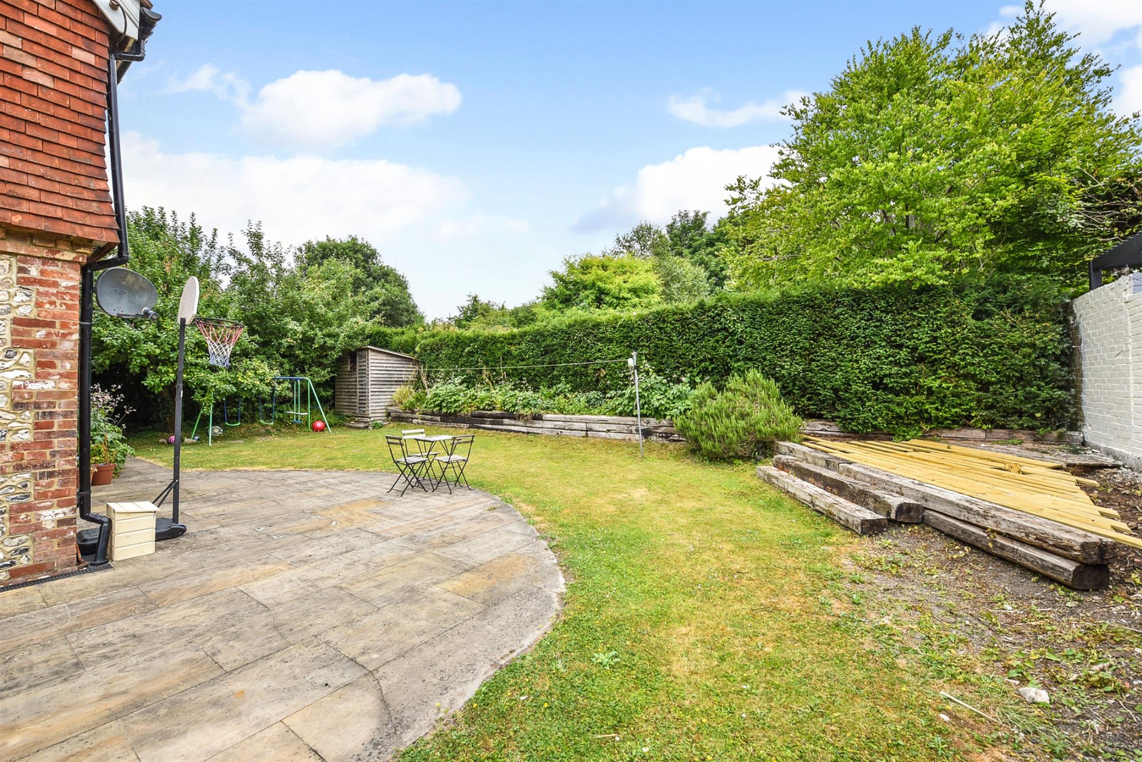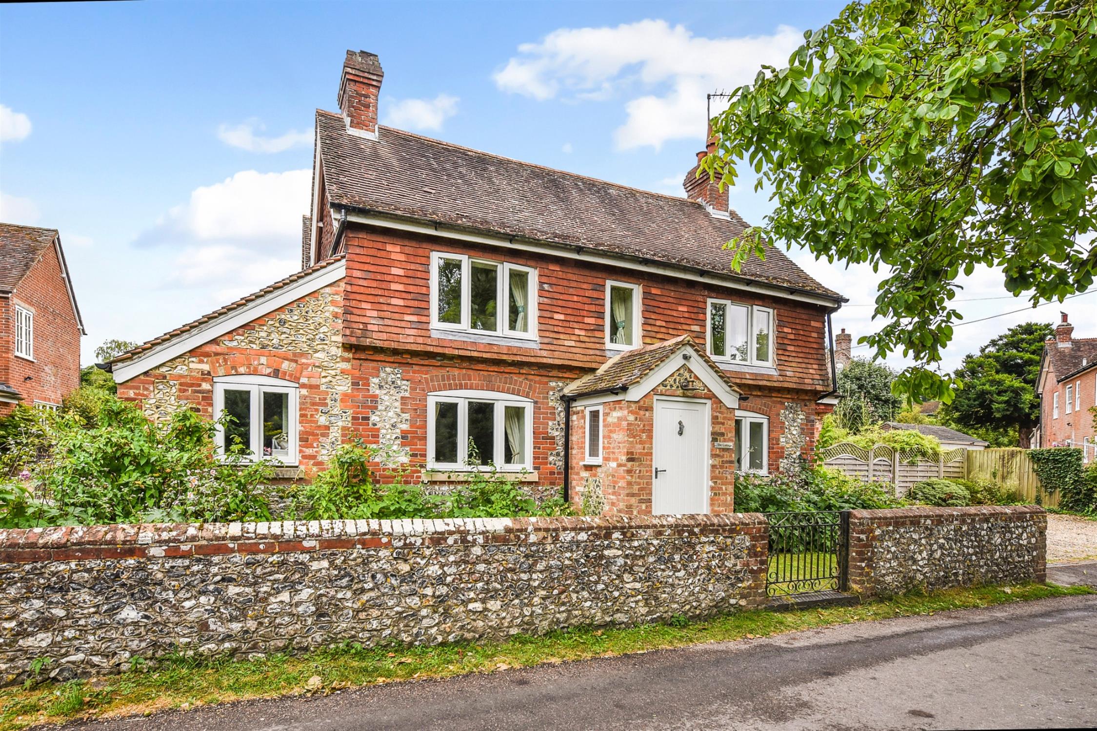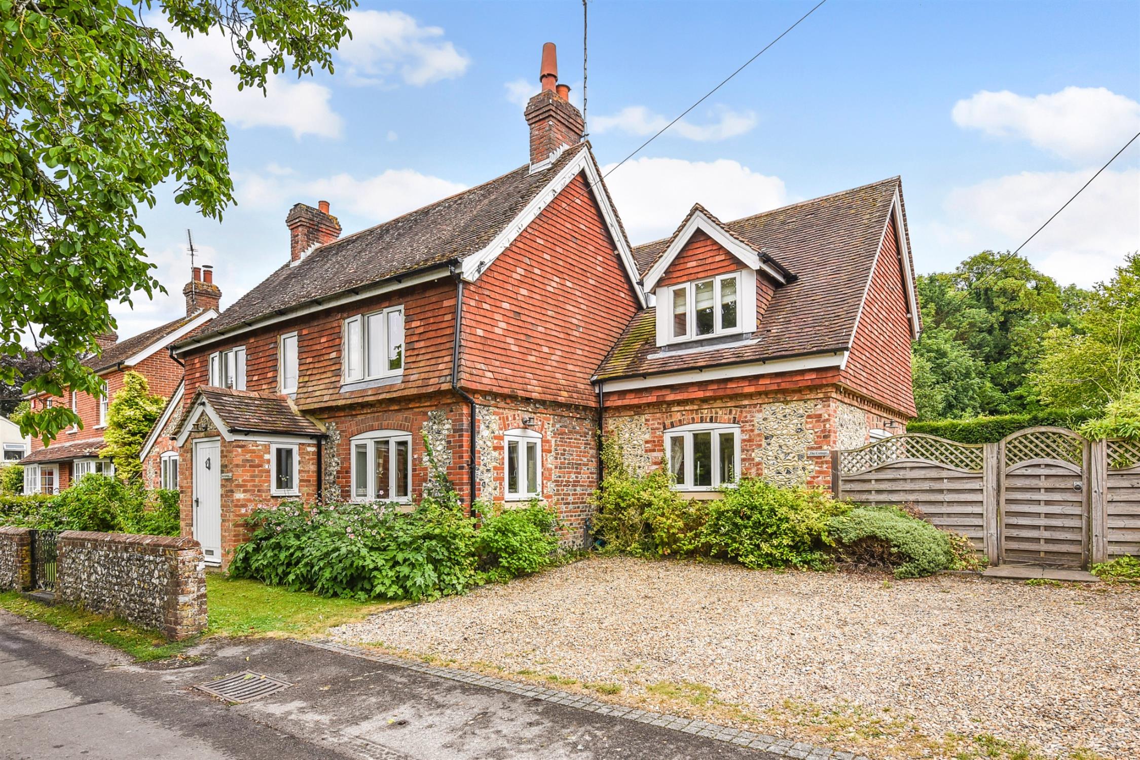 The cottage garden to the front is bordered by an attractive flint wall and laid to lawn. Alongside the house there are flower borders and a parking area. There is a fence and pedestrian gate leading to the side and rear garden which is enclosed and mainly laid to lawn with a raised flower border and raised decking area. A paved terrace extends to the side and rear, of the house.