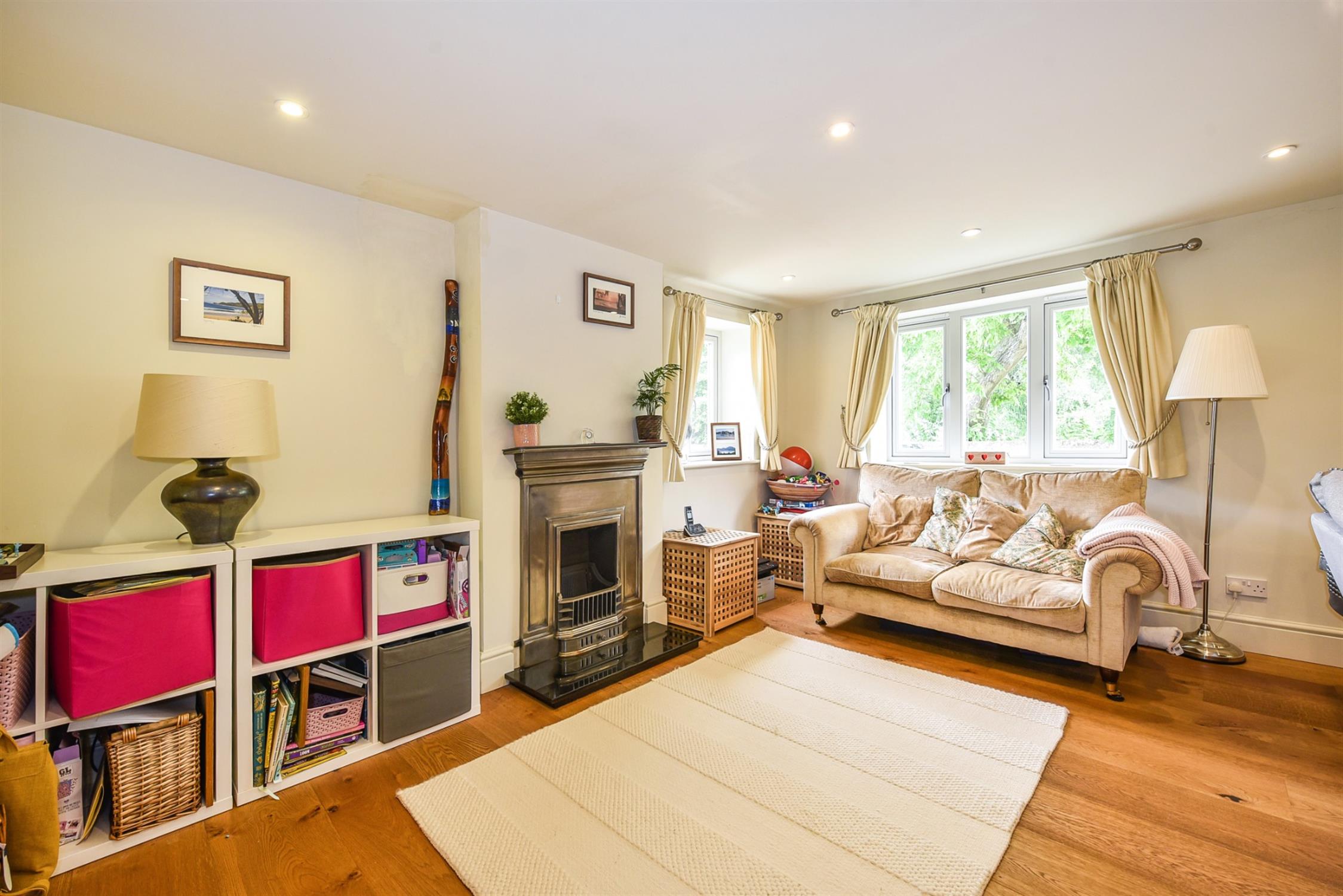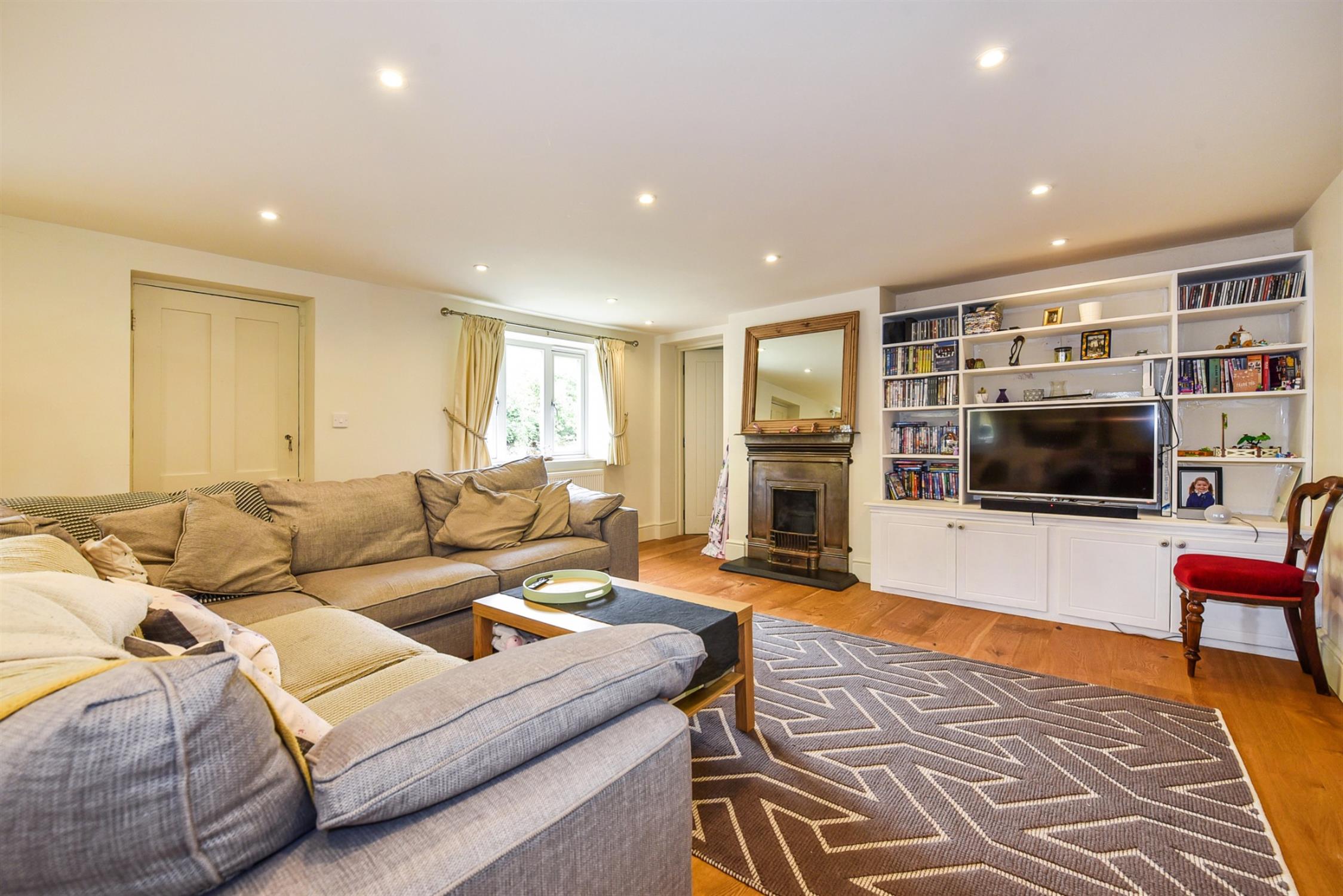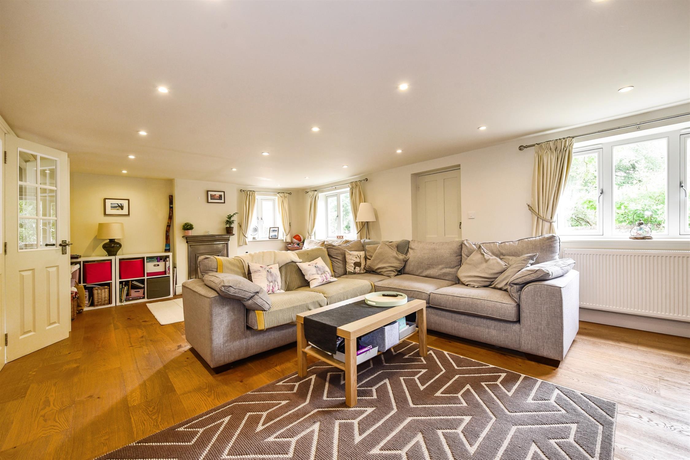 Lovely spacious dual aspect room with two attractive fireplace surrounds. Oak flooring. Two double glazed windows to the front aspect and one to the side. Two radiators. Inset ceiling lighting. Bi-folding internal doors opening onto the kitchen/dining room. Door to the hallway and door to: