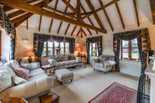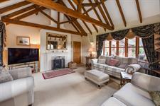 Impressive and well proportioned sitting room with an open eave, beamed ceiling. Triple aspect, with windows to the front and side elevations enjoying views over the garden. Attractive fireplace with fitted wood burning stove. Wall light points.