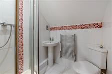 Fitted with a white suite comprising tiled shower cubicle. Fitted furniture with enclosed cistern WC and wash hand basin. Heated towel rail. Tiled floor. Velux style window. Inset lighting.