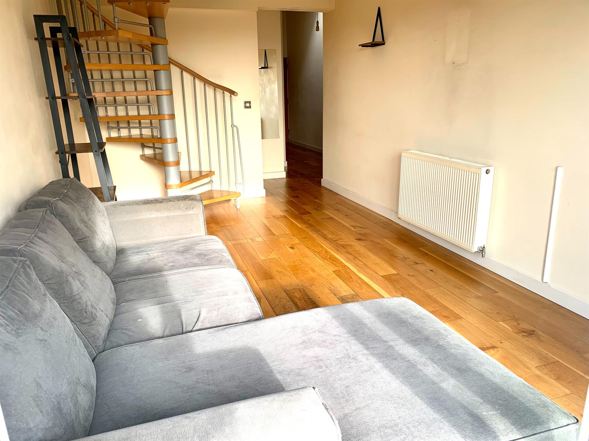 A good-sized room with plenty of natural light from the patio doors accessing the balcony that looks over the rear of the development and a small window to the side. The wooden floor leads the way to the spiral staircase to the first floor.