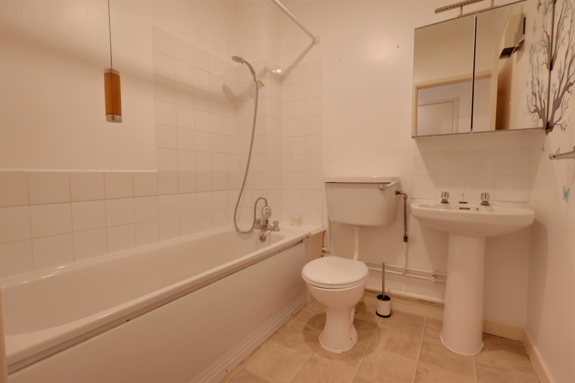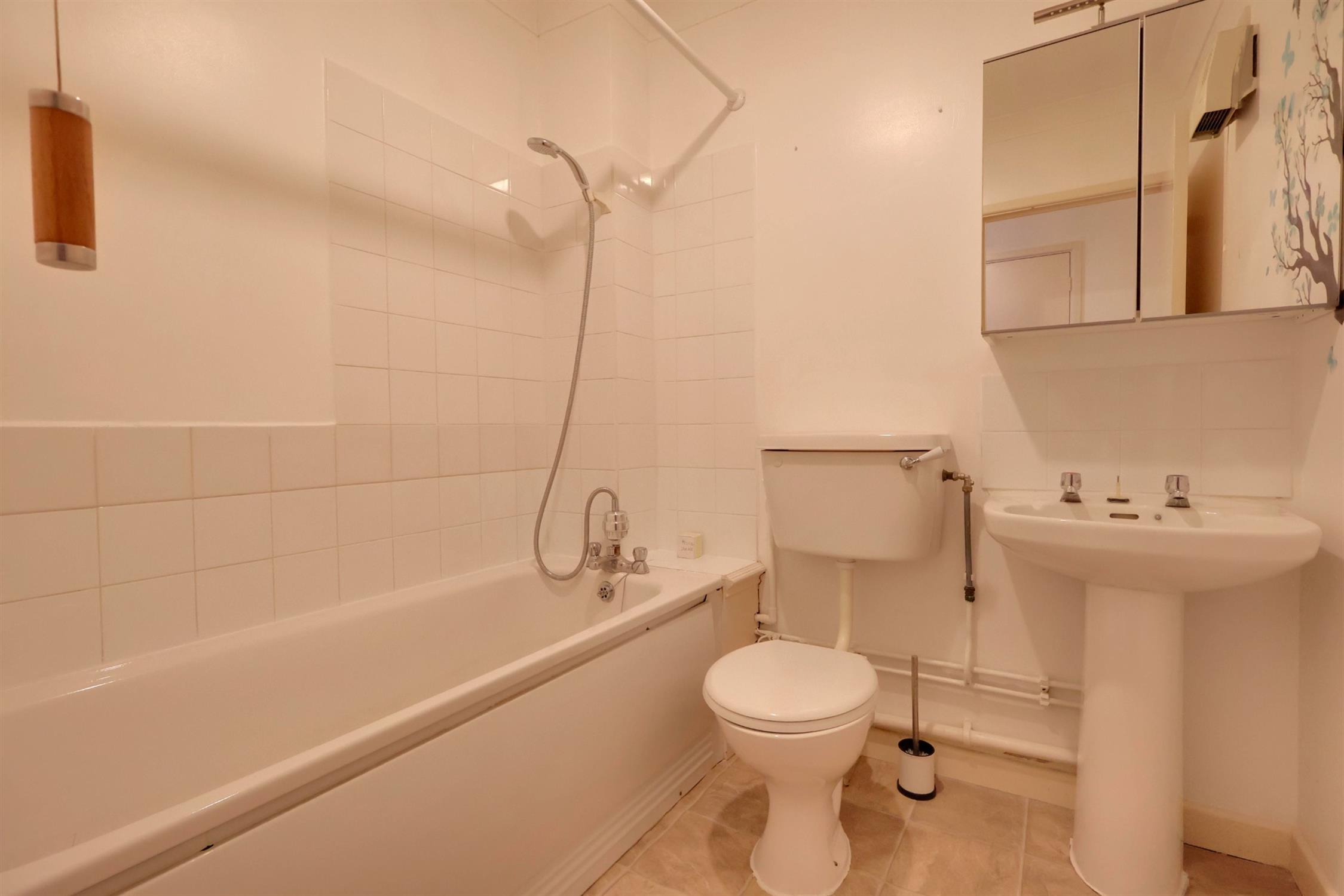 BathroomThree-piece suite, comprising of low level WC, panelled bath and sink with vanity unit above, extractor fan, laminate flooring.